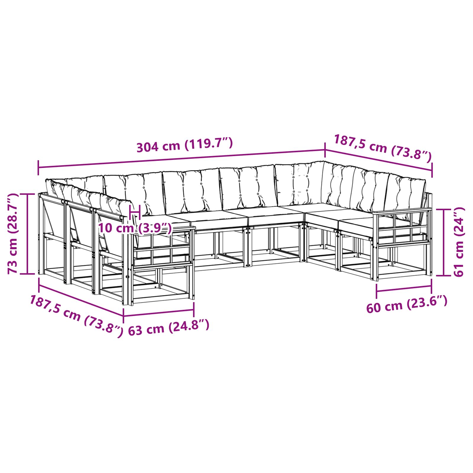 - 7 x Canapea Mijloc: 59 x 63 x 73 cm (LxWxH)