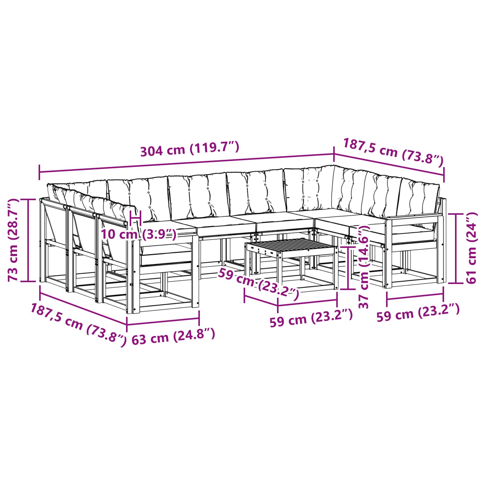 - 7 x Canapea de mijloc: 59 x 63 x 73 cm (LxWxH)