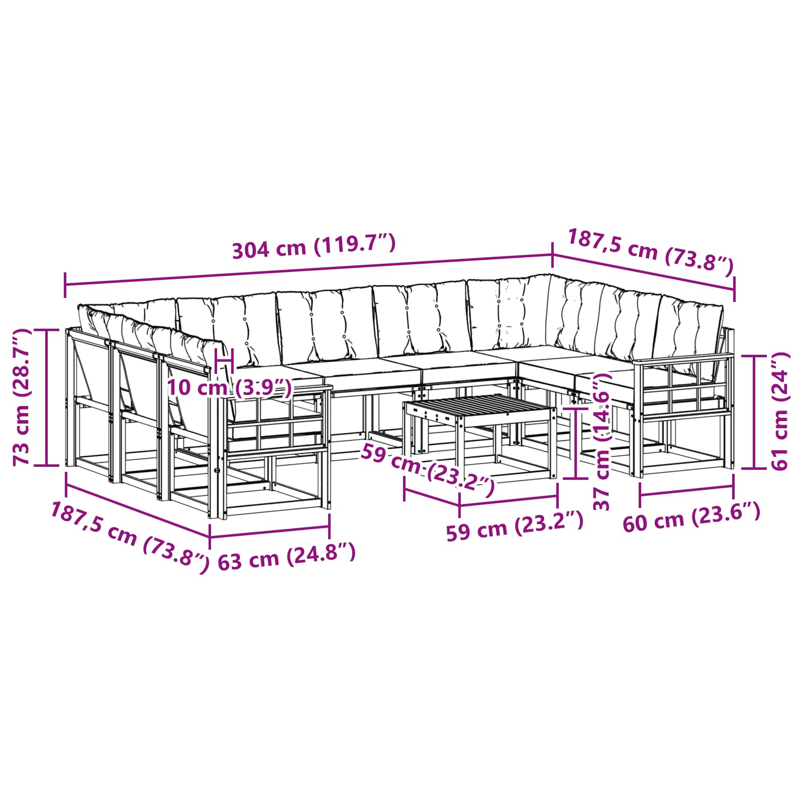 - 7 x Canapea de mijloc: 59 x 63 x 73 cm (LxWxH)