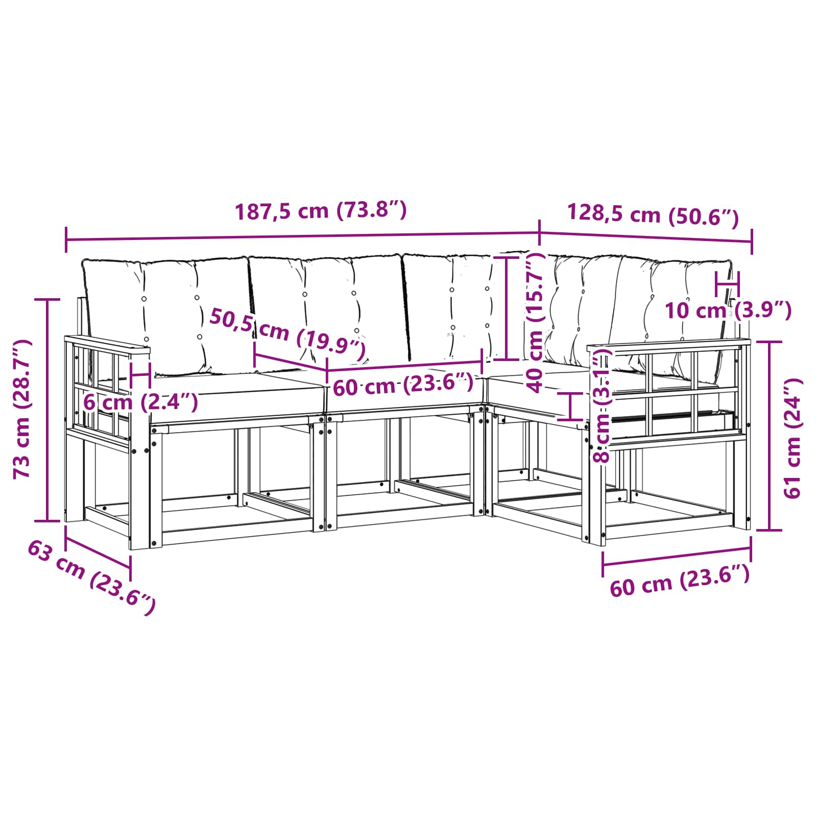- 1 x Canapea colț: 63 x 63 x 73 cm (LxWxH)