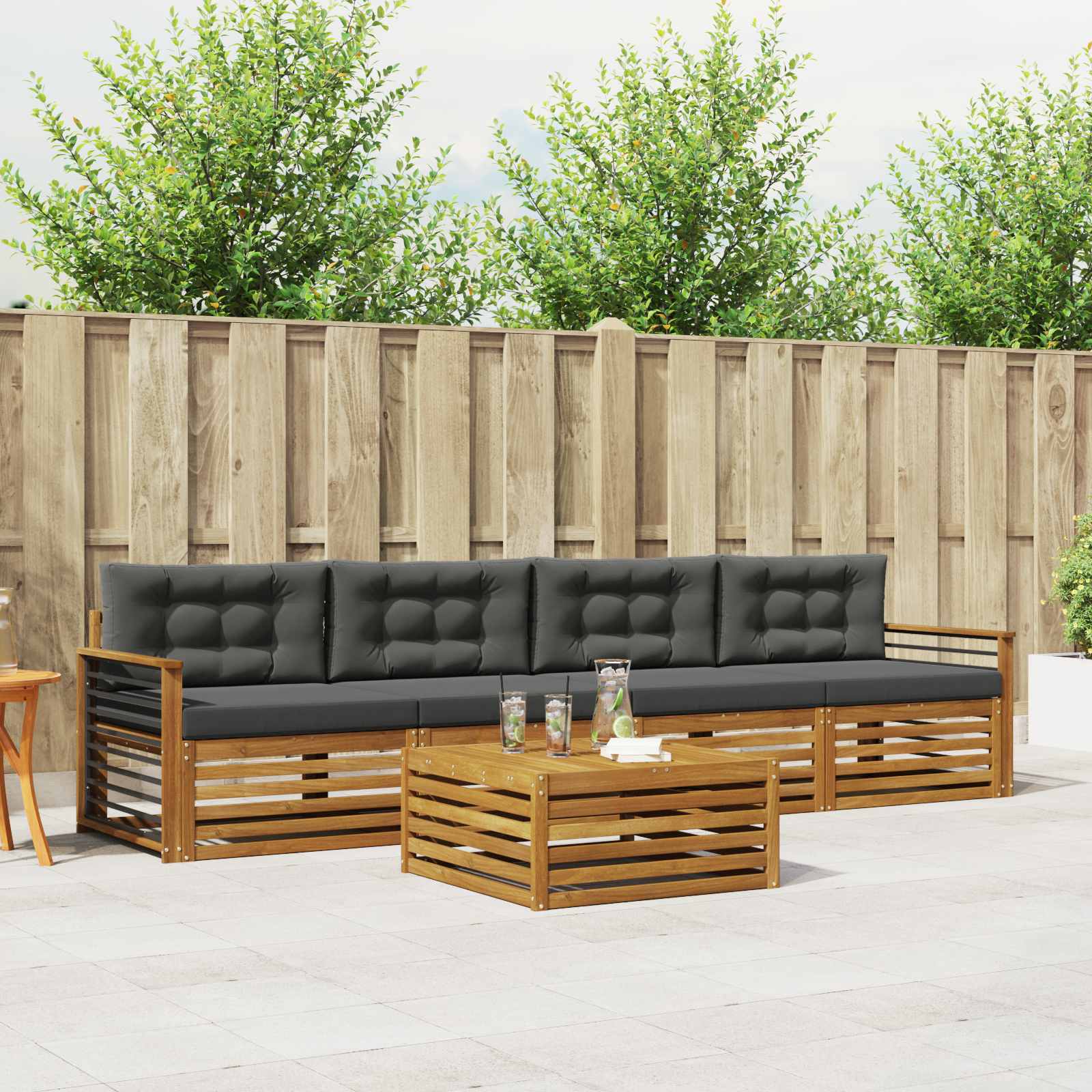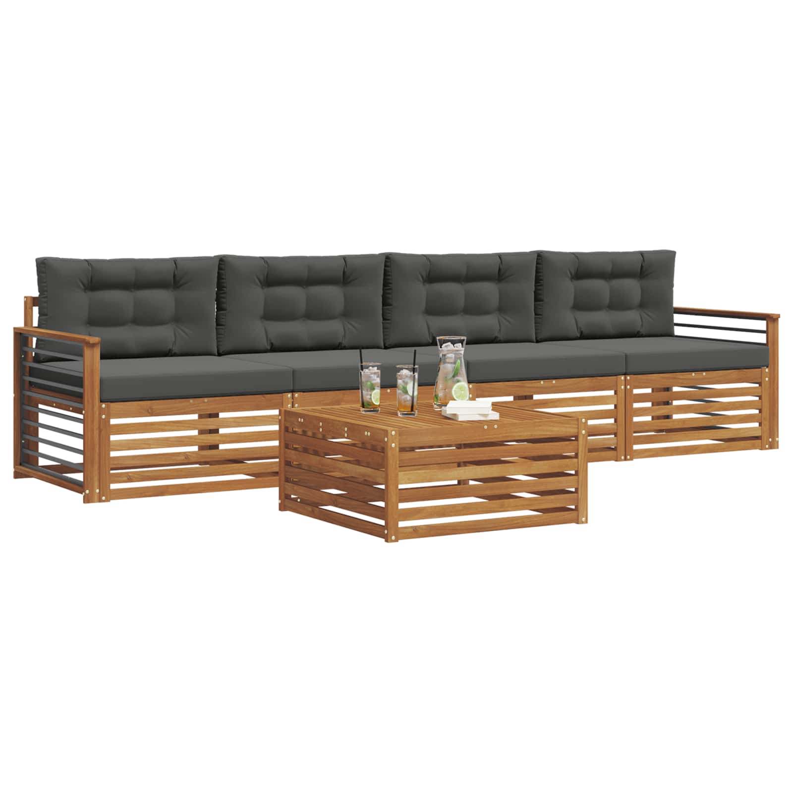 Setul de mobilier pentru exterior combină stilul cu funcționalitatea, devenind un punct de atracție pentru orice grădină sau terasă. Designul său modern, cu linii curate și detalii minime, adaugă eleganță și sprijină relaxarea în aer liber și întâlnirile cu prietenii. Fabricat din lemn masiv de acacia, setul e durabil și are un aspect vizual plăcut pe termen lung, fiind ideal pentru cei care vor atât utilitate, cât și un design atrăgător în exterior.