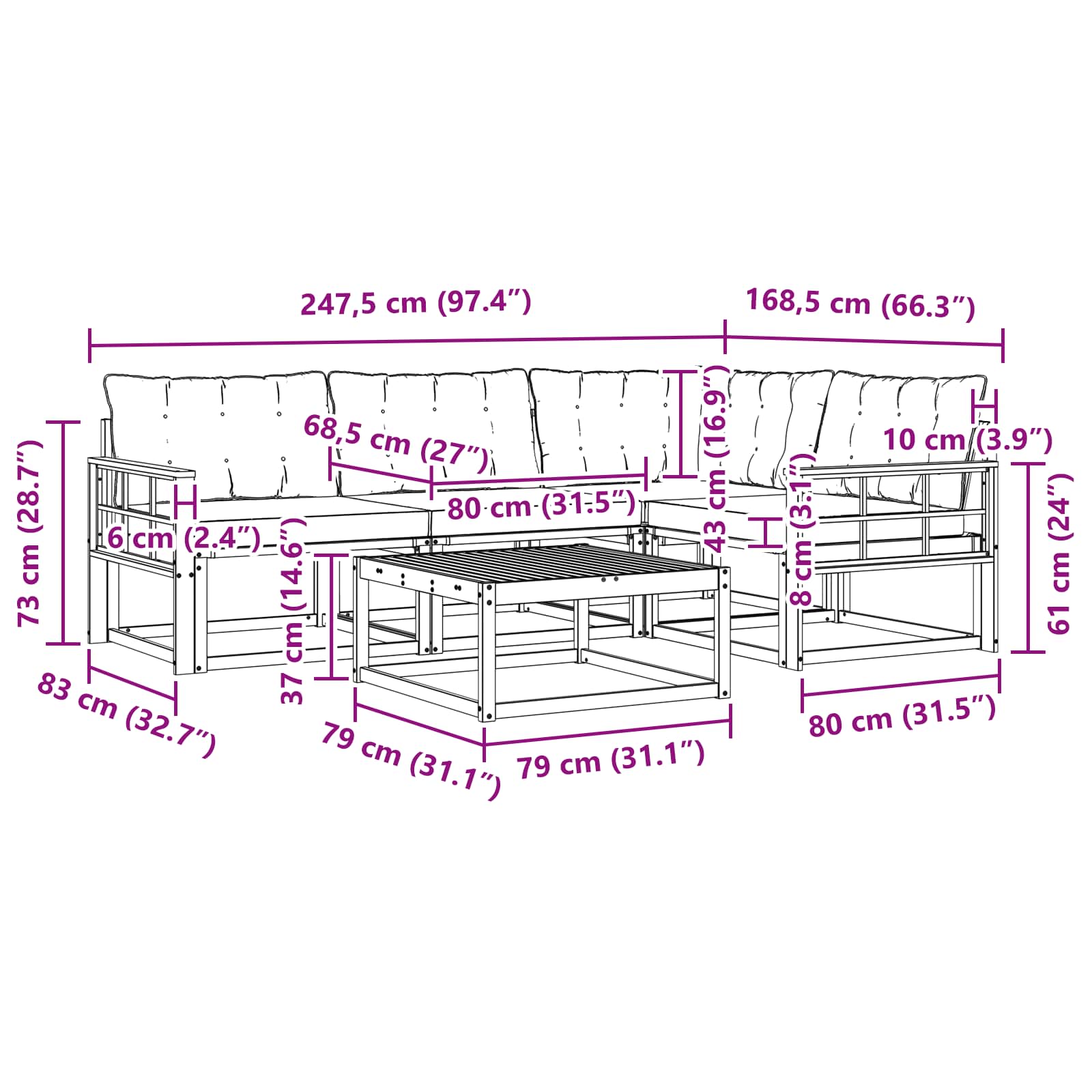 - 3 x Canapea din mijloc: 79 x 83 x 73 cm (LxWxH)