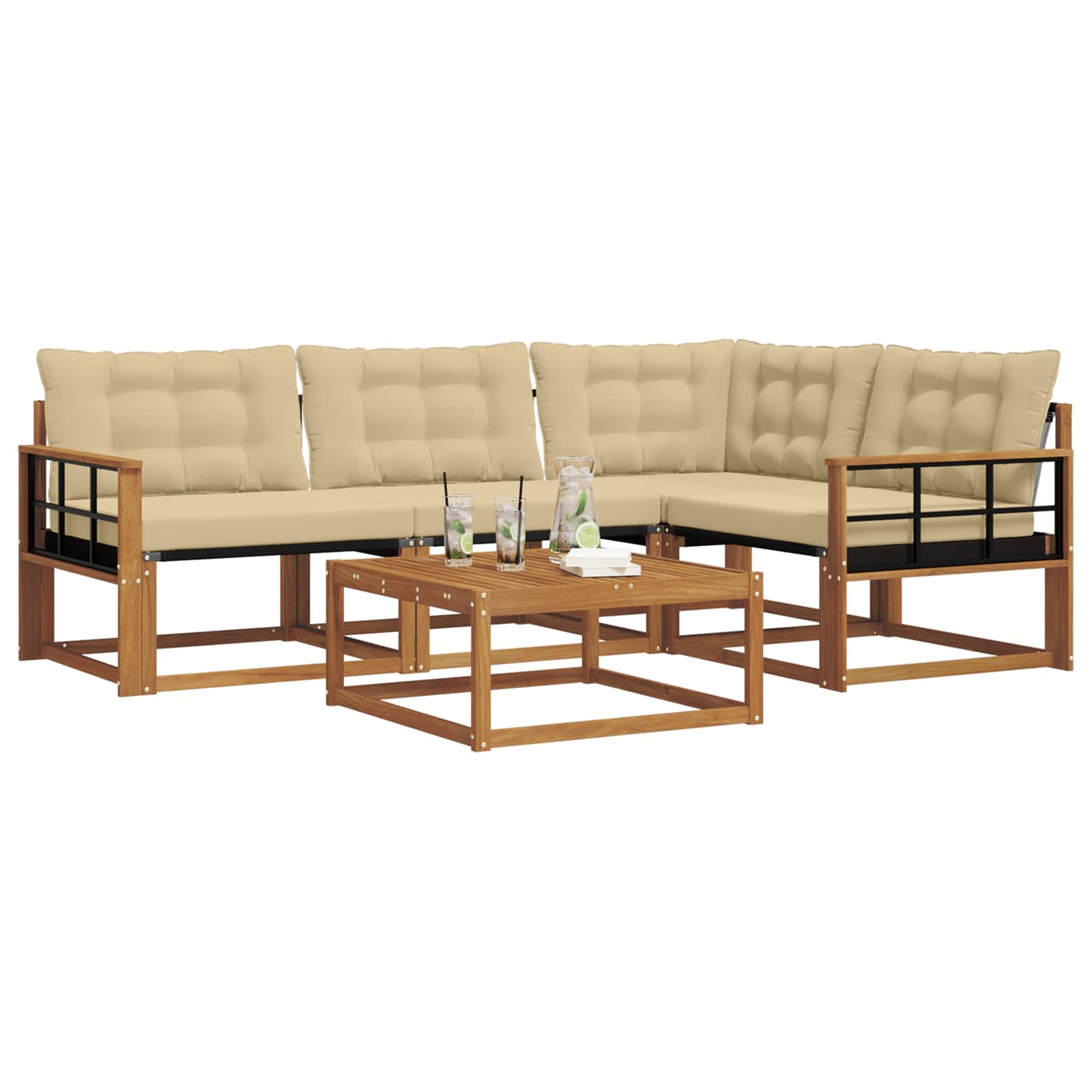 - Cadru din lemn de acacia: Setul are un cadru din lemn de acacia, cunoscut pentru rezistența și textura sa naturală care îmbunătățește decorul de afară. Nuanța bogată conferă un aspect cald, oferind totodată durabilitate.