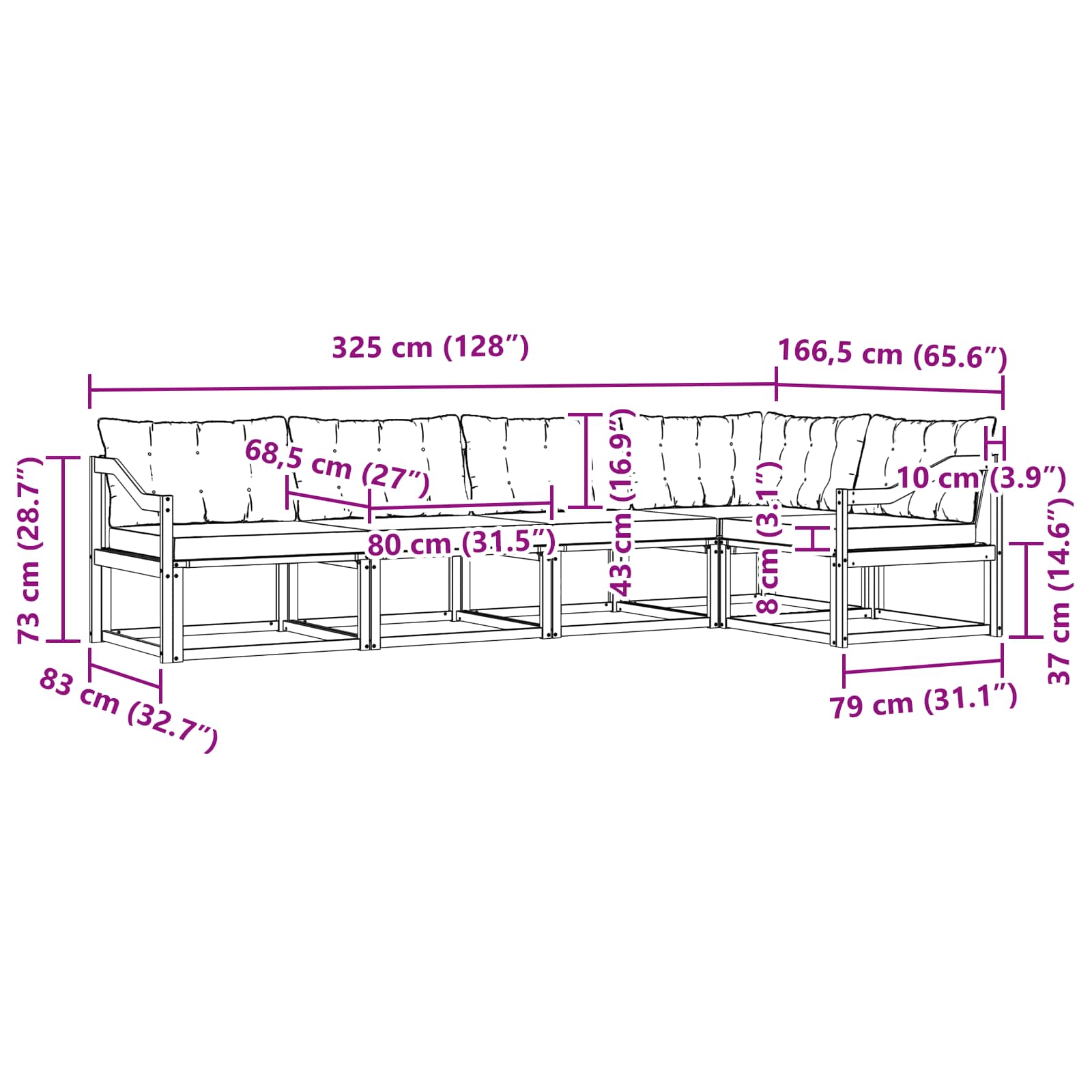- 6 x Pernă de Spate: 80 x 43 x 10 cm (LxWxH)