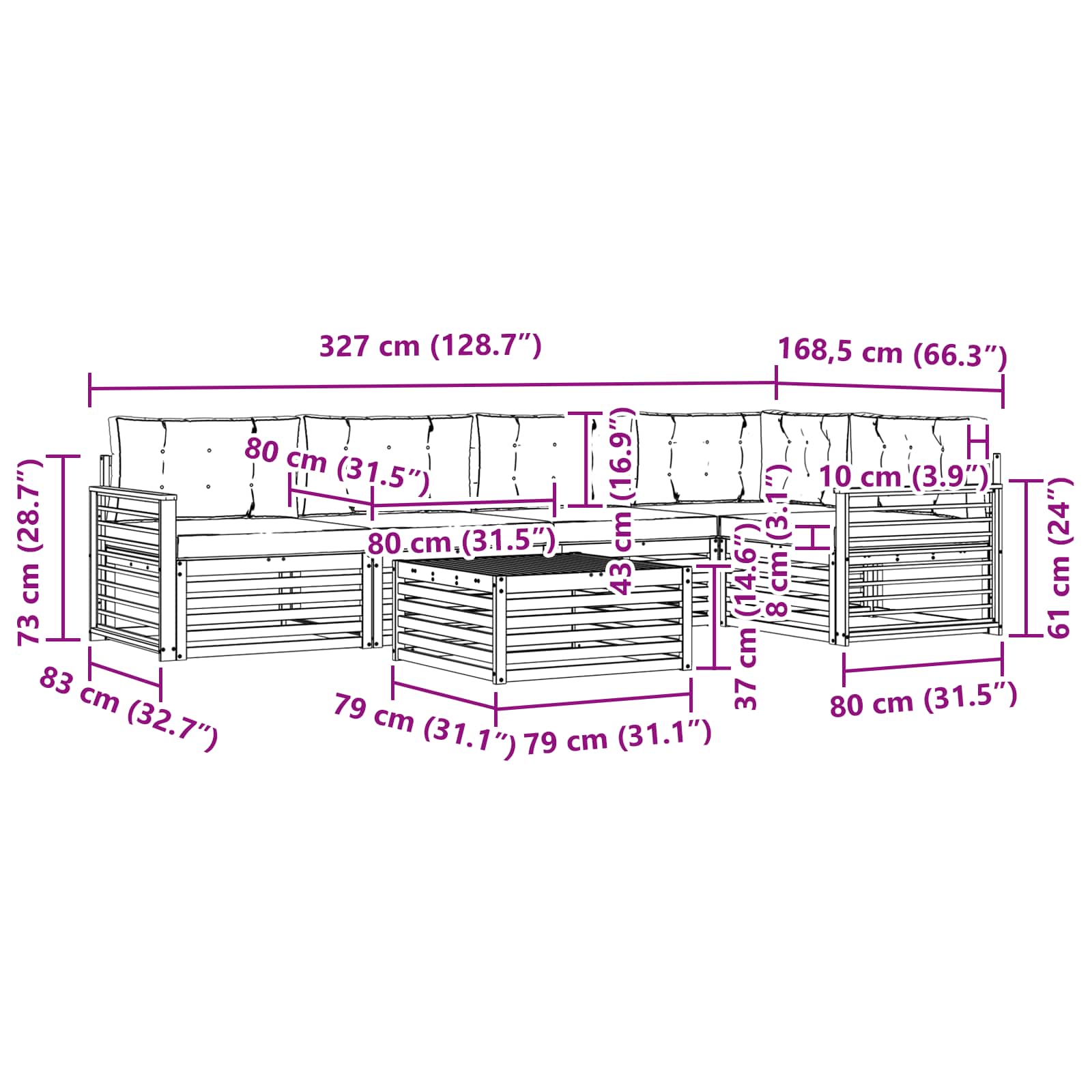 - 6 x Pernă de Spate: 80 x 43 x 10 cm (LxWxH)