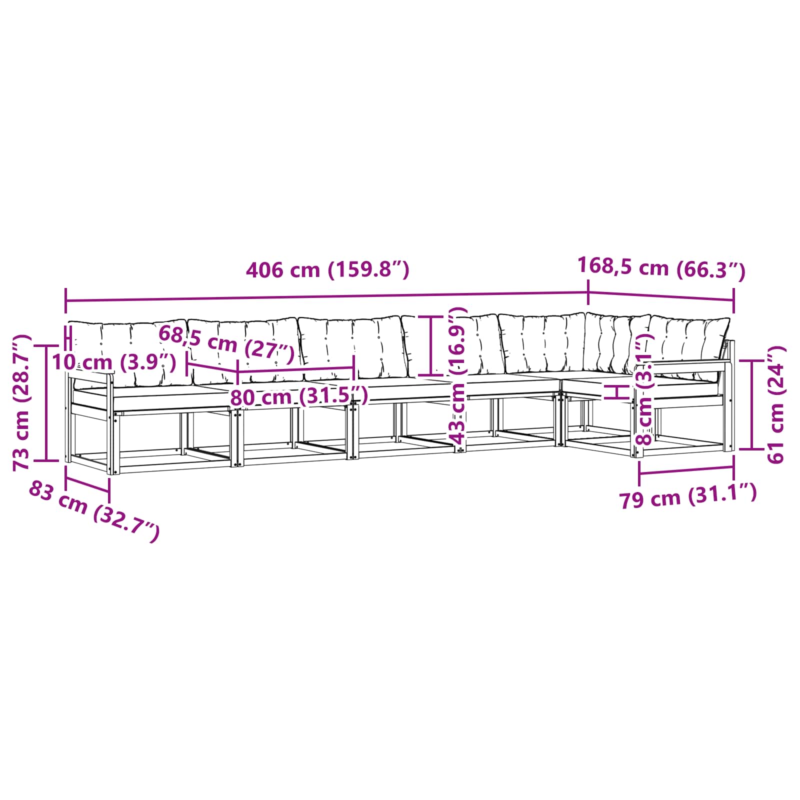 - 5 x Canapea de mijloc: 79 x 83 x 73 cm (LxWxH)
