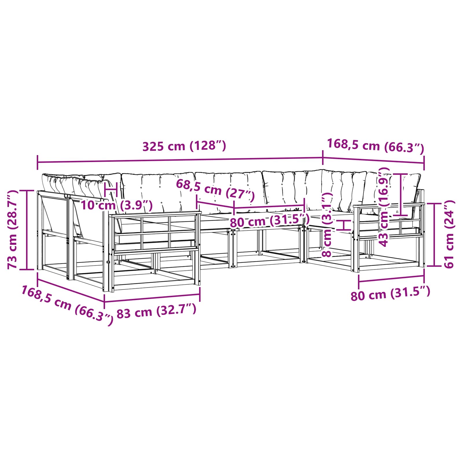 - 8 x Pernă de spate: 80 x 43 x 10 cm (LxWxH)