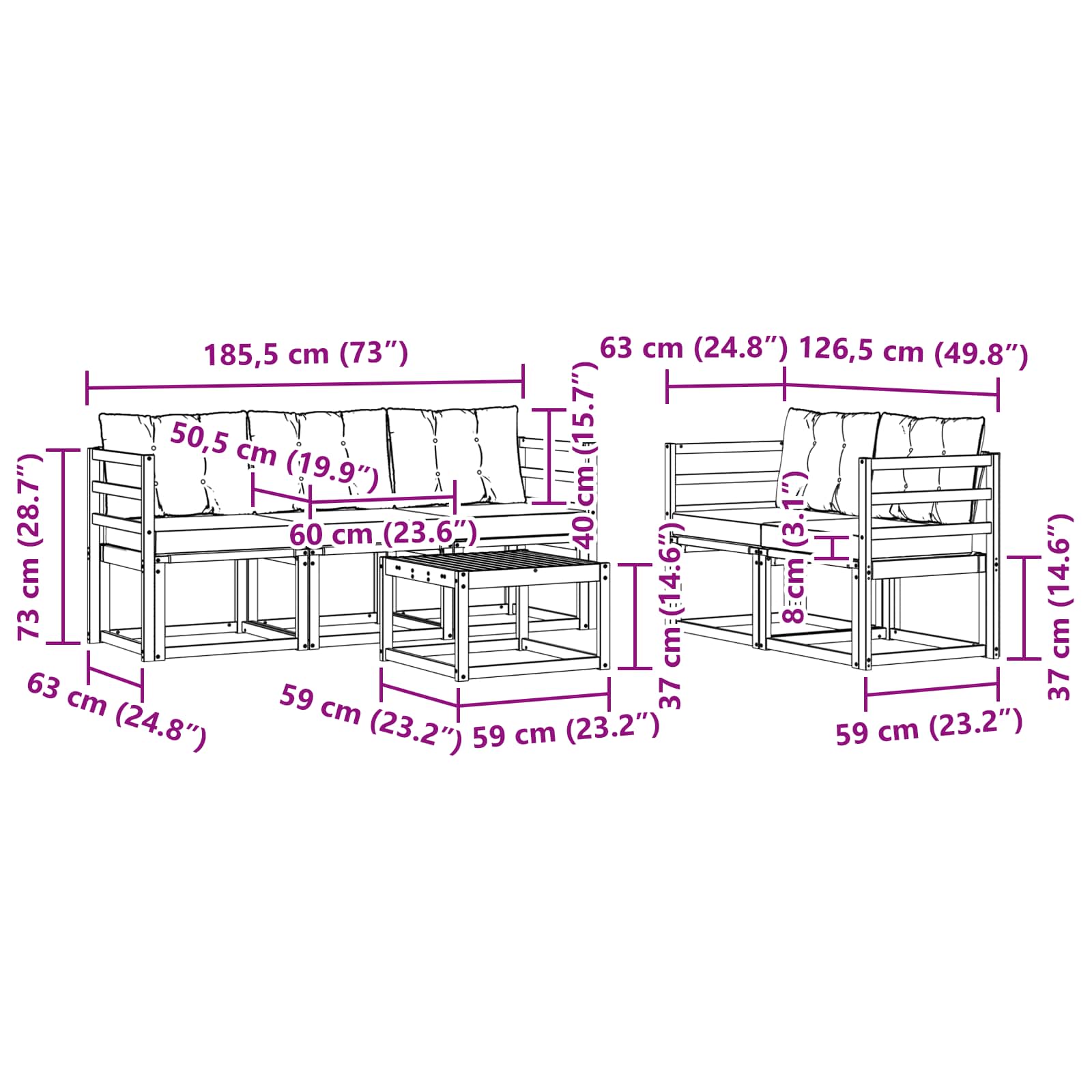 - 5 x Canapea Intermediară: 59 x 63 x 73 cm (LxWxH)