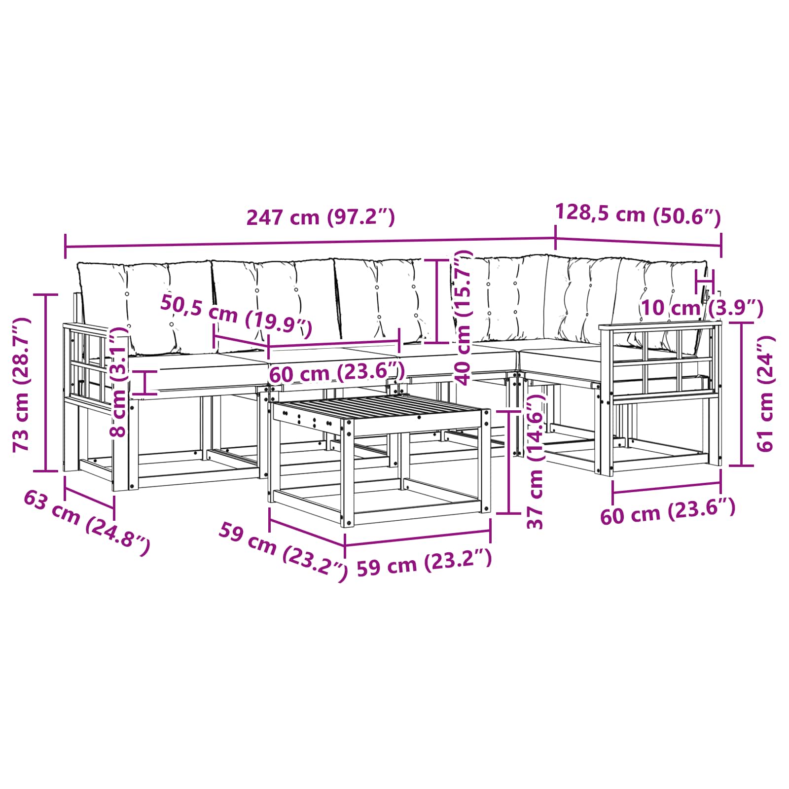 - 4 x Canapea mijloc: 59 x 63 x 73 cm (LxWxH)