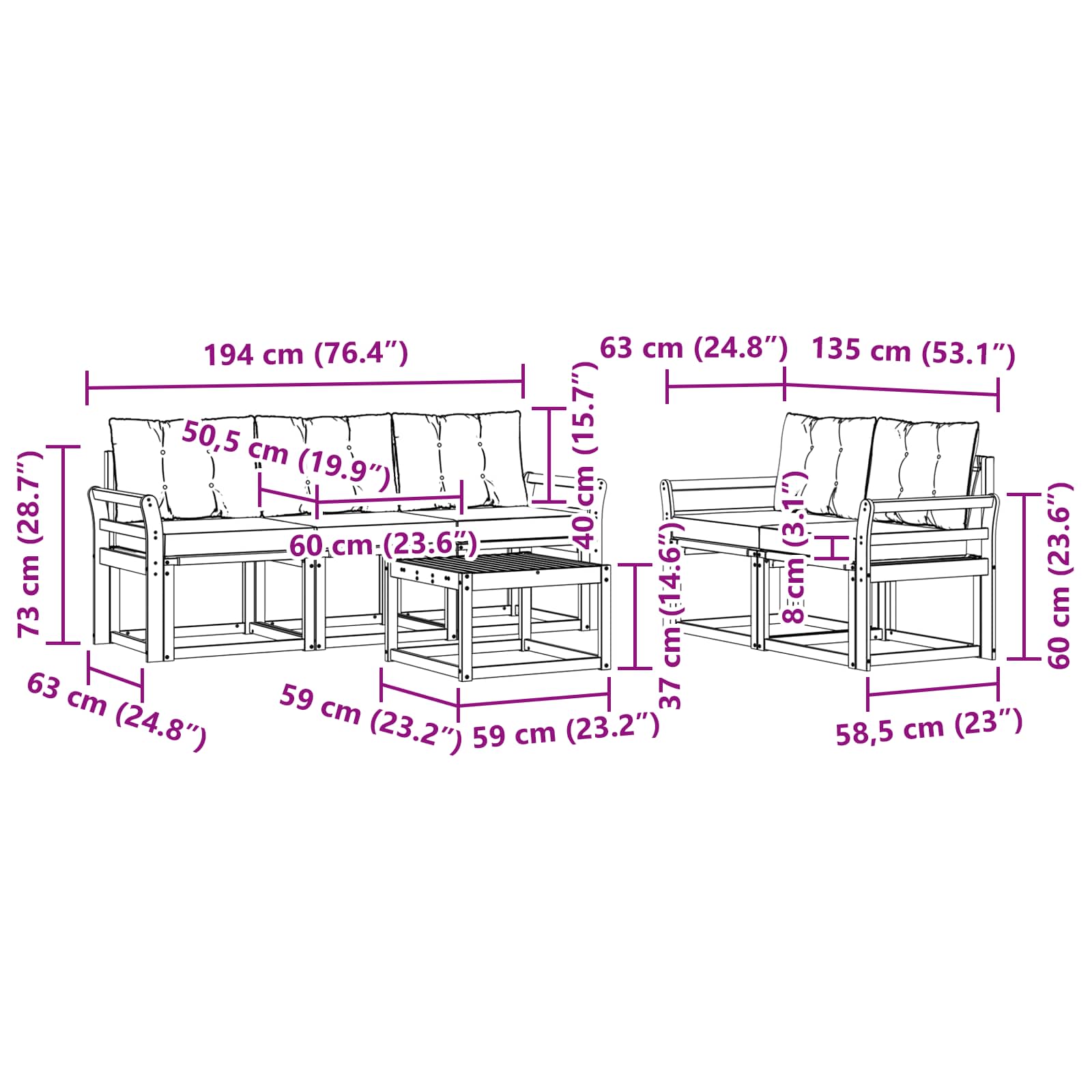 - 5 x Canapea Intermediară: 59 x 63 x 73 cm (LxWxH)