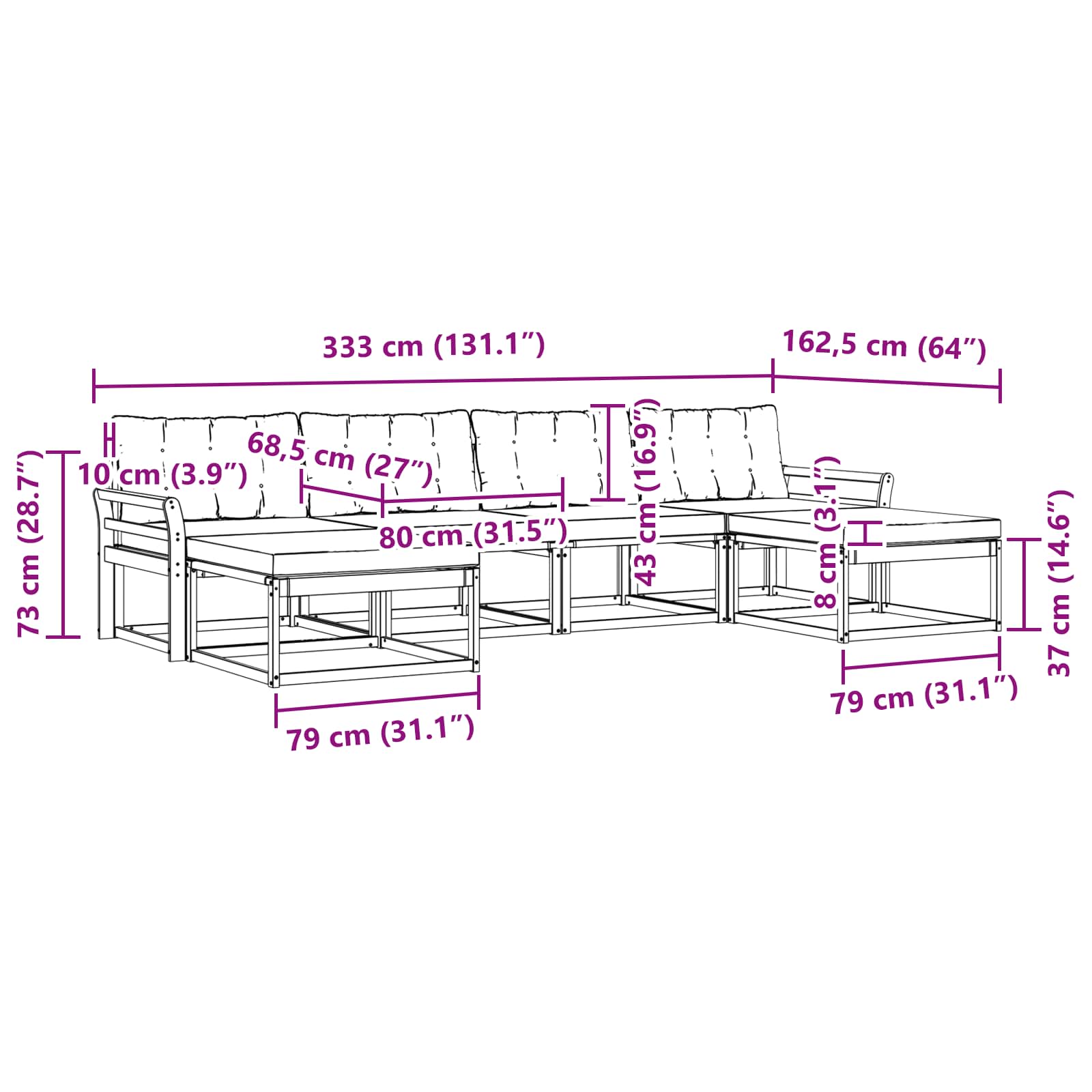 - 4 x Canapea medie: 79 x 83 x 73 cm (LxWxH)