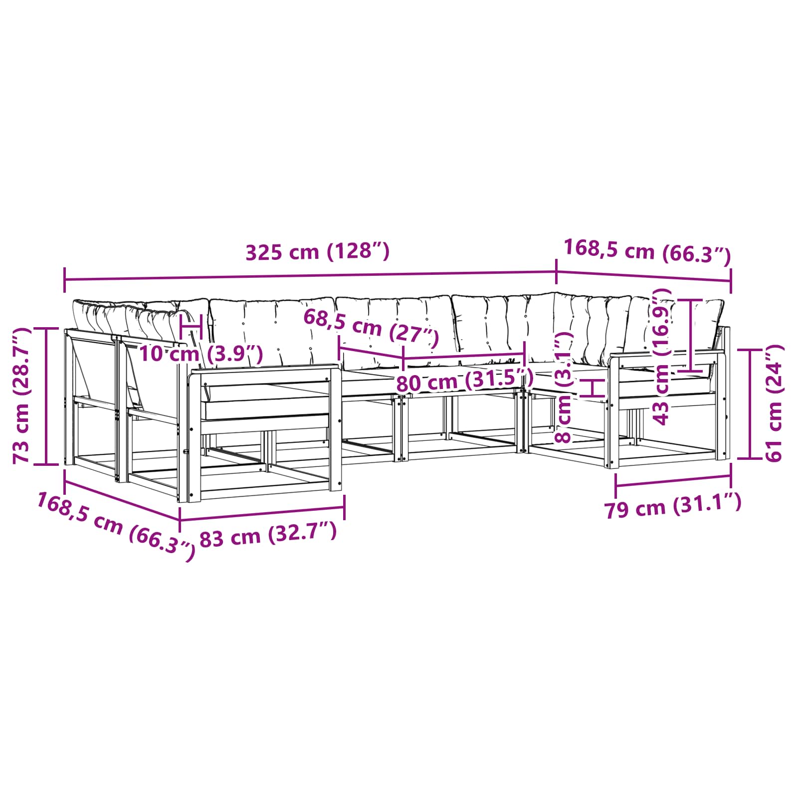 - 8 x Pernă de spate: 80 x 43 x 10 cm (LxWxH)