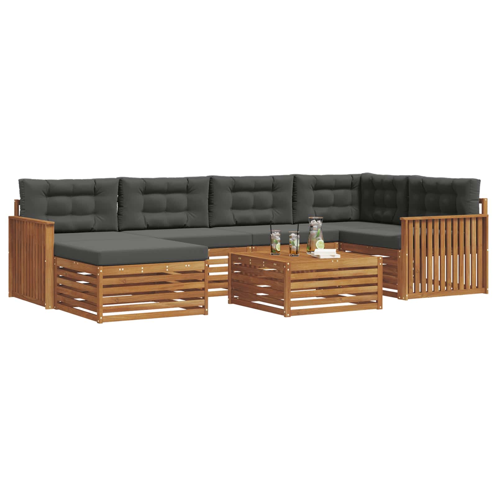 Setul de mobilier pentru exterior îmbină stilul cu utilitatea, făcându-se remarcat în orice grădină sau terasă. Designul modern, cu linii curate și detalii simple, aduce eleganță și ajută la relaxare și întâlniri sociale în aer liber. E complet din lemn masiv de acacia, asigurându-se că e durabil și arată bine pentru mult timp, ideal pentru cei care doresc un mobilier practic și elegant at the same time.