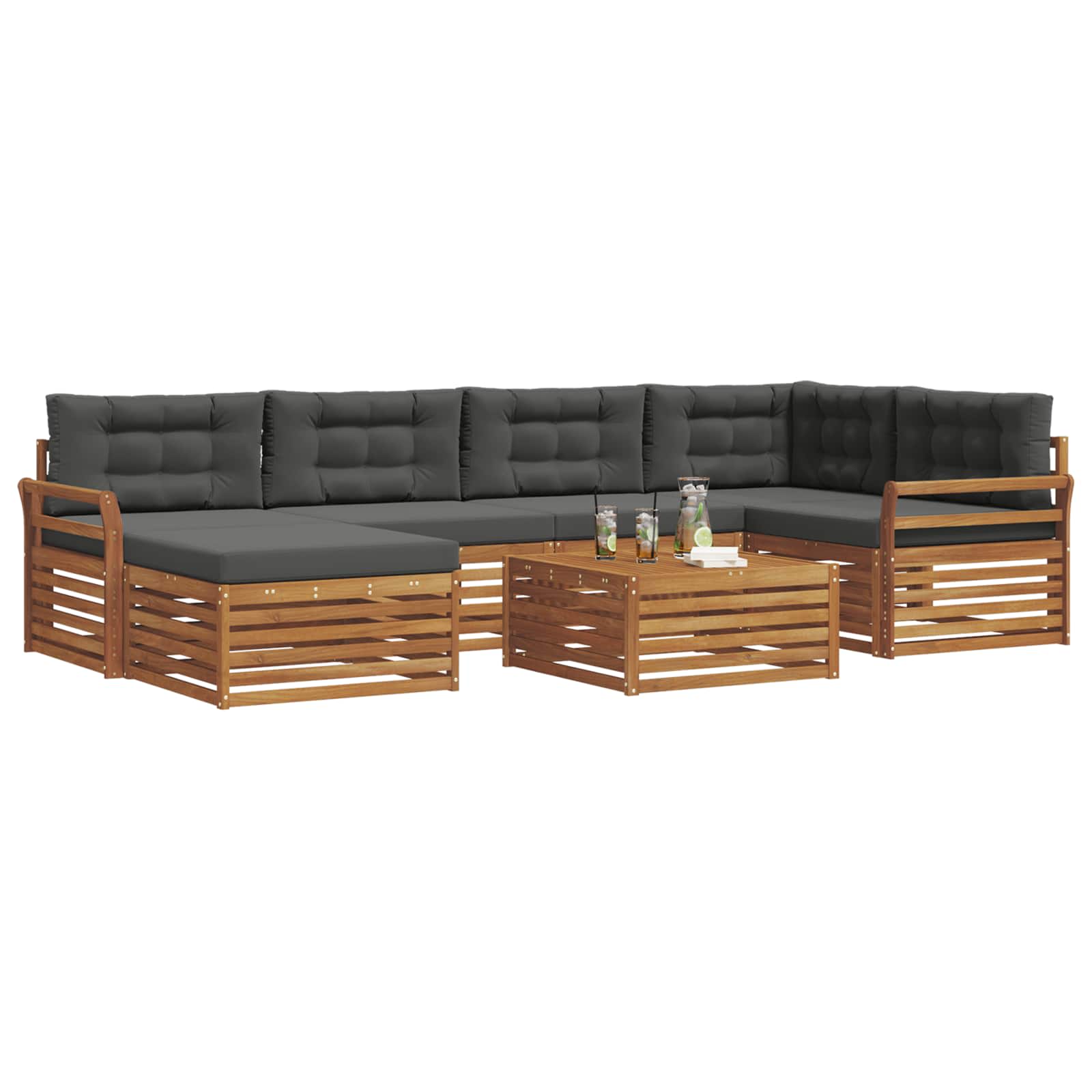 Setul de mobilier pentru exterior îmbină stilul cu utilitatea, făcându-se remarcat în orice grădină sau terasă. Designul modern, cu linii curate și detalii simple, aduce eleganță și ajută la relaxare și întâlniri sociale în aer liber. E complet din lemn masiv de acacia, asigurându-se că e durabil și arată bine pentru mult timp, ideal pentru cei care doresc un mobilier practic și elegant at the same time.