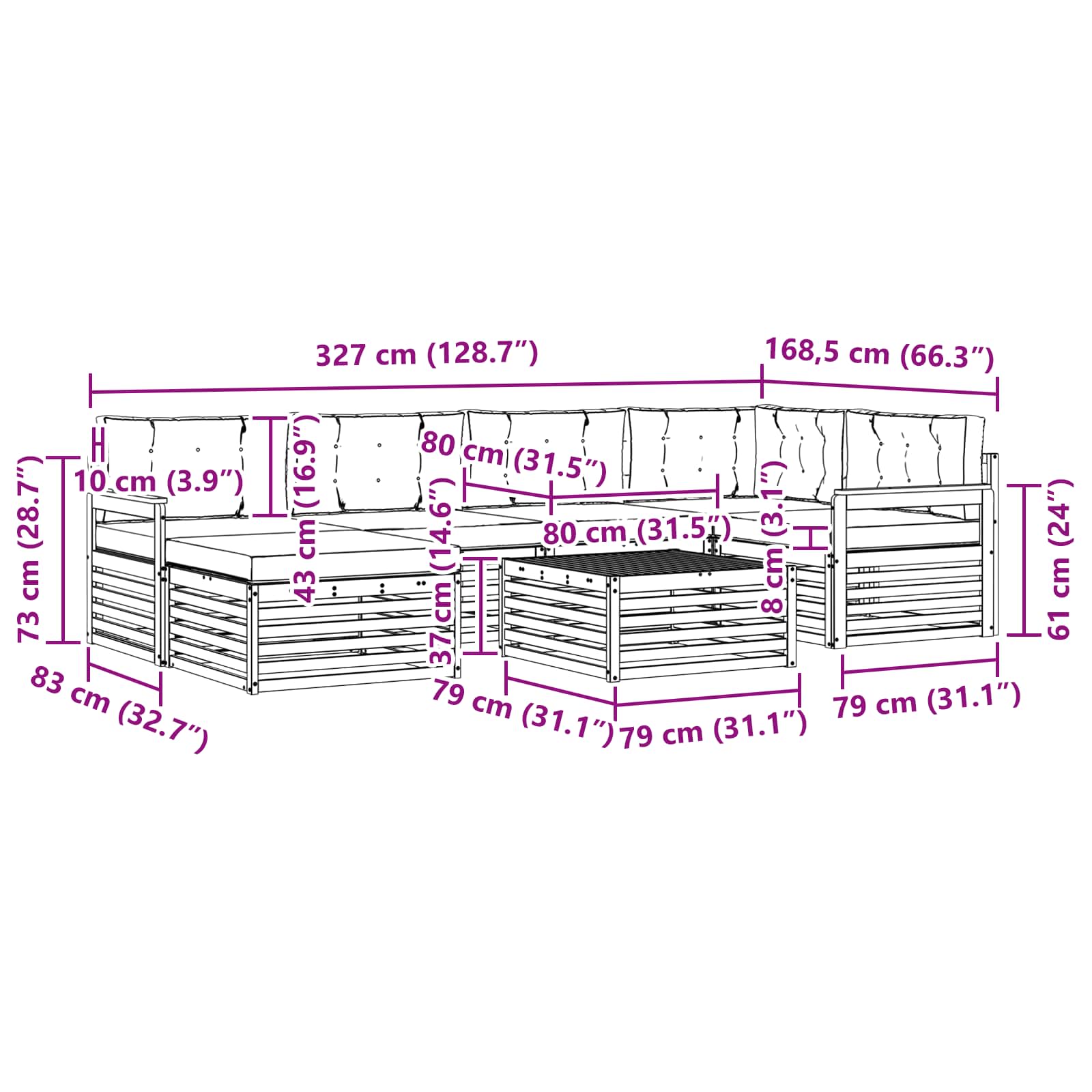 - 6 x Pernă de șezut: 80 x 80 x 8 cm (Lxlxh)
