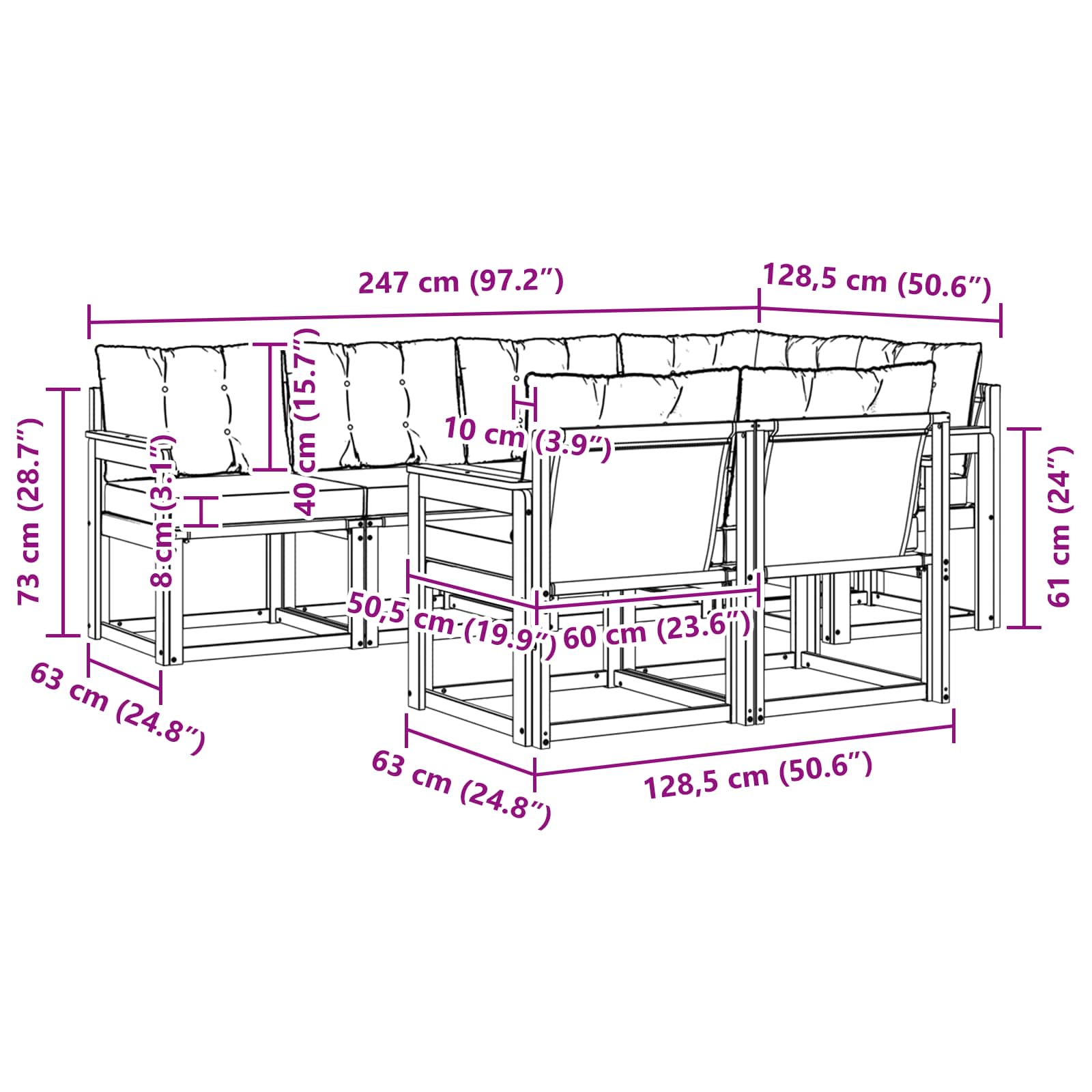 - 6 x Canapea de mijloc: 59 x 63 x 73 cm (LxWxH)