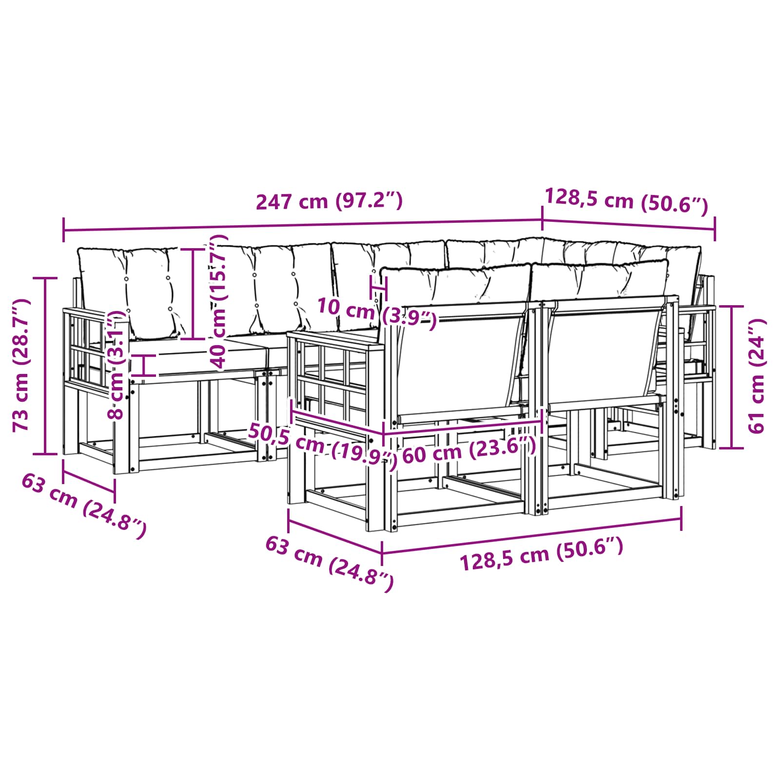 - 6 x Canapea de mijloc: 59 x 63 x 73 cm (LxWxH)