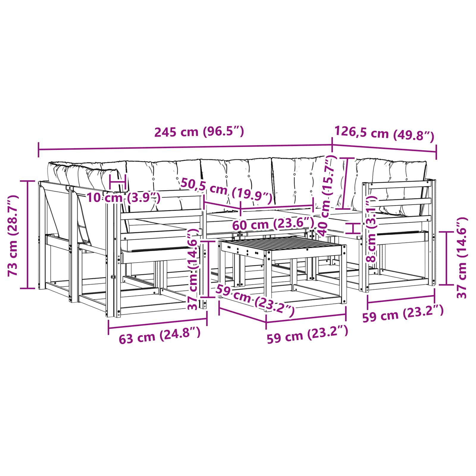 - 4 x Canapea mijloc: 59 x 63 x 73 cm (LxWxH)