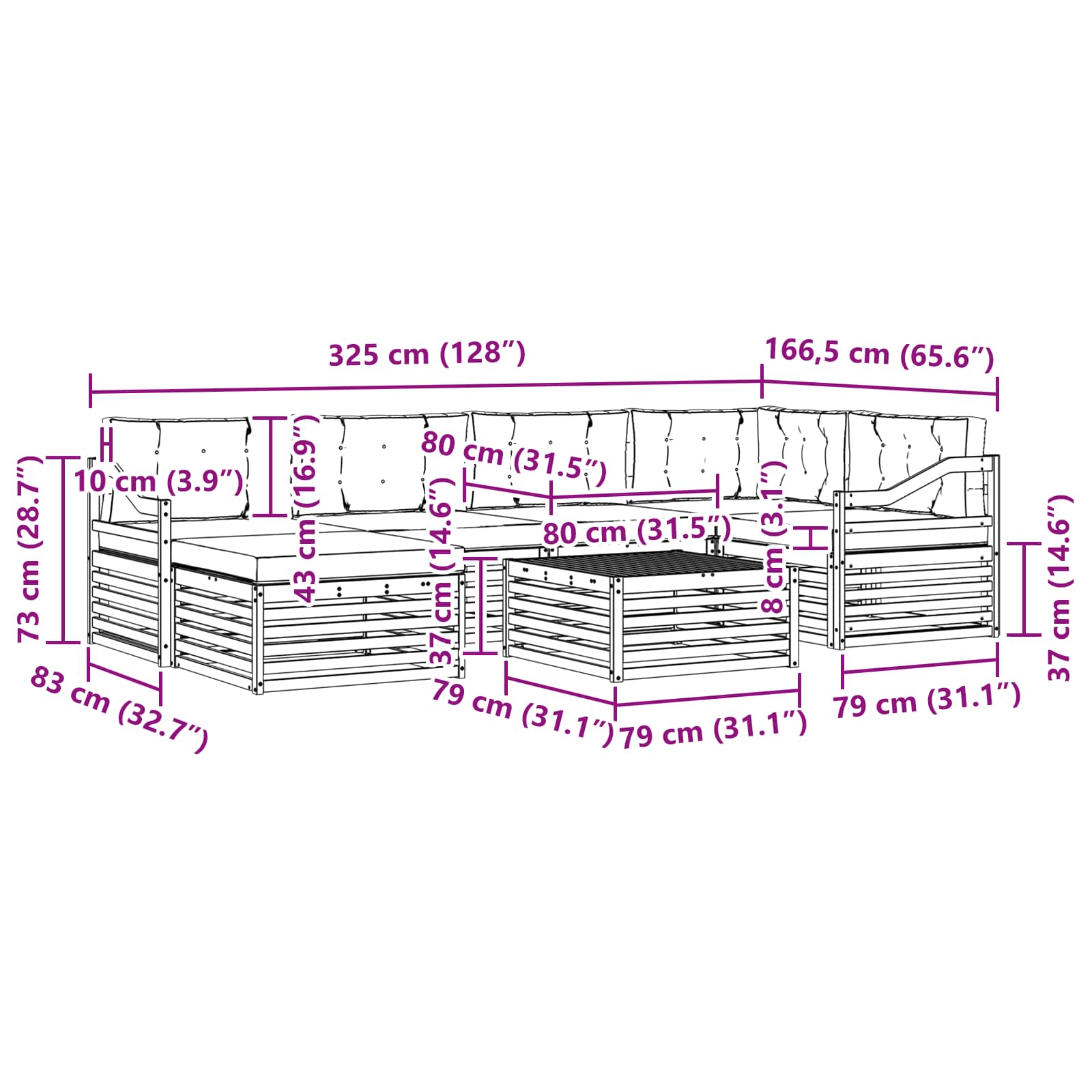 - 4 x Canapea din mijloc: 79 x 83 x 73 cm (Lxlxh)