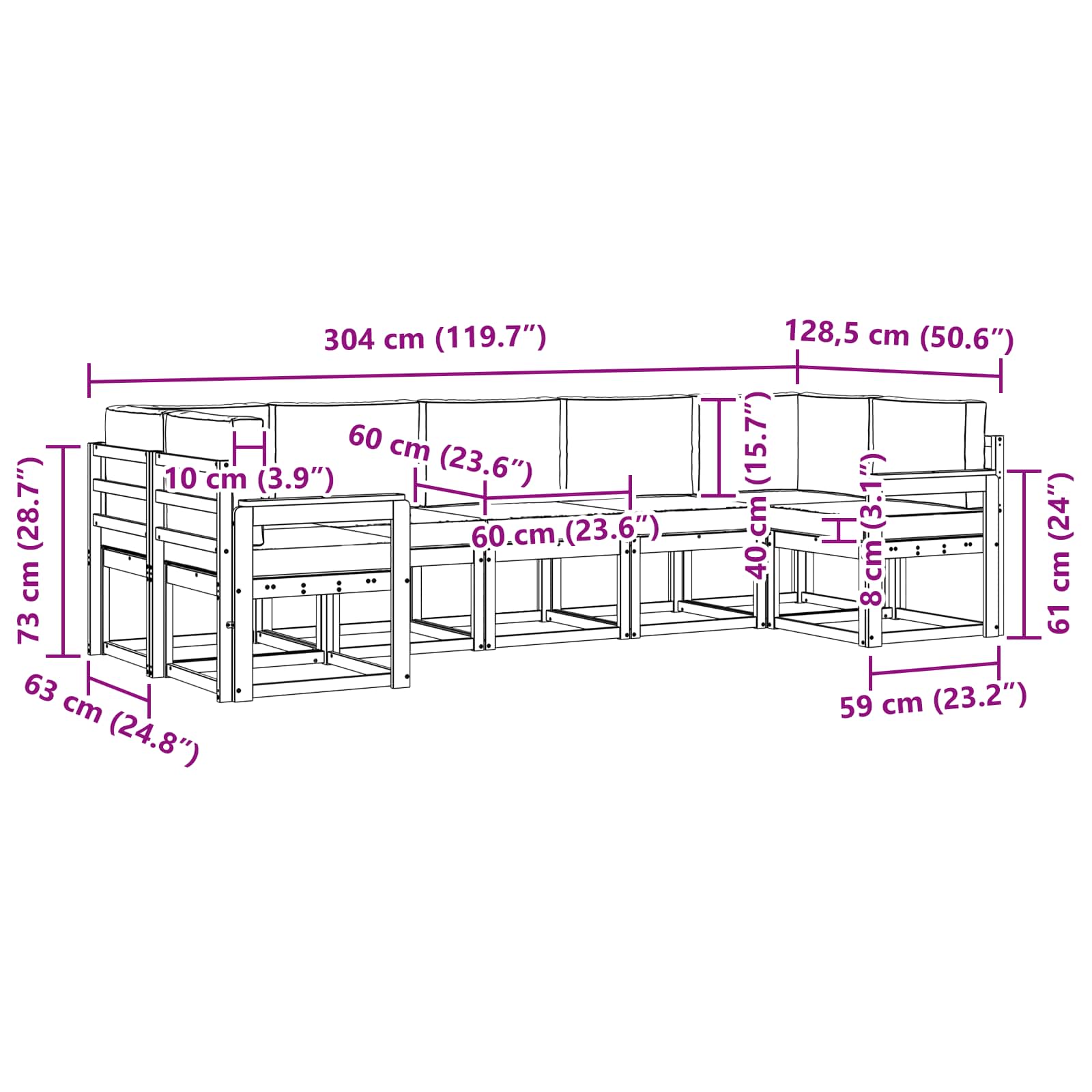 - 5 x Canapea Mijloc: 59 x 63 x 73 cm (L x l x h)