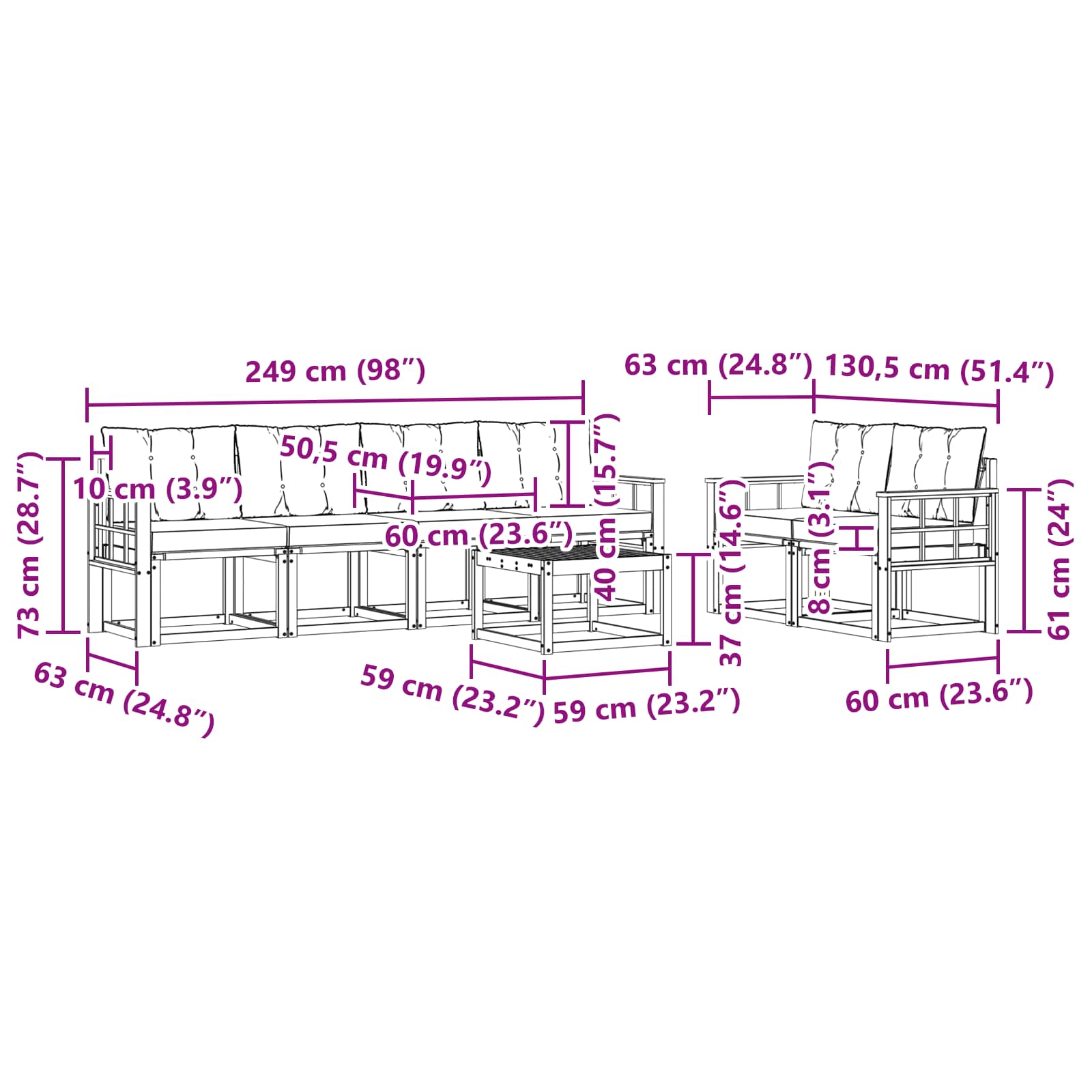 - 6 x Canapea intermediară: 59 x 63 x 73 cm (LxWxH)