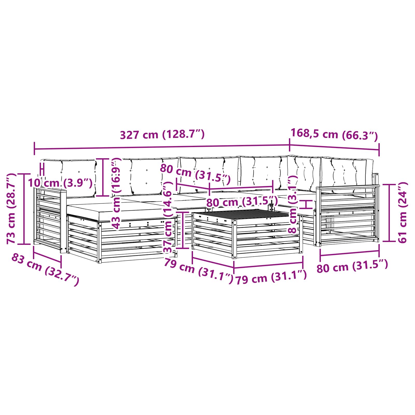 - 4 x Canapea din mijloc: 79 x 83 x 73 cm (Lxlxh)
