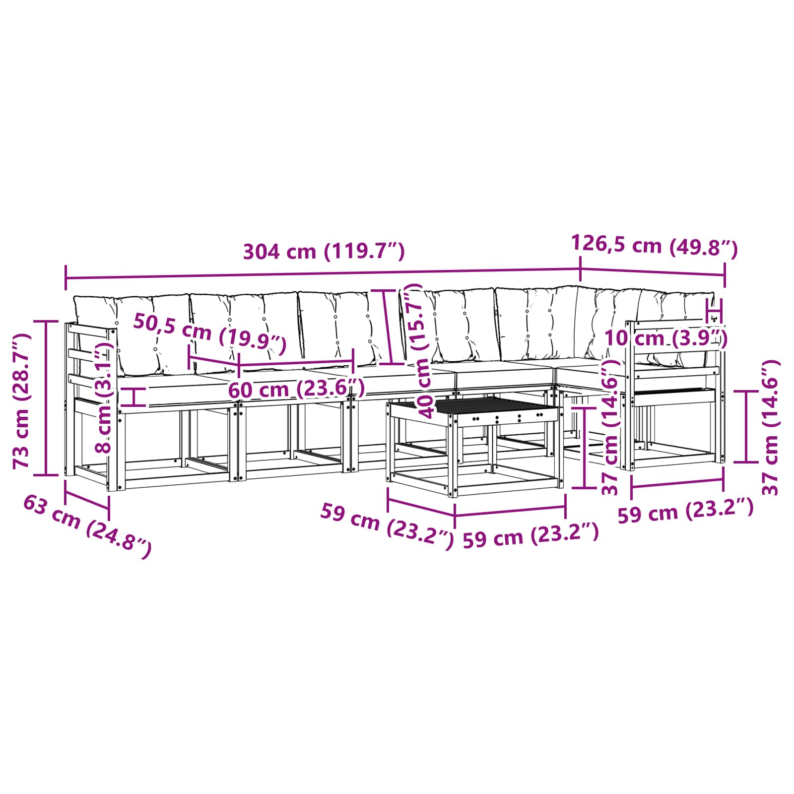 - 5 x Canapea de mijloc: 59 x 63 x 73 cm (LxWxH)