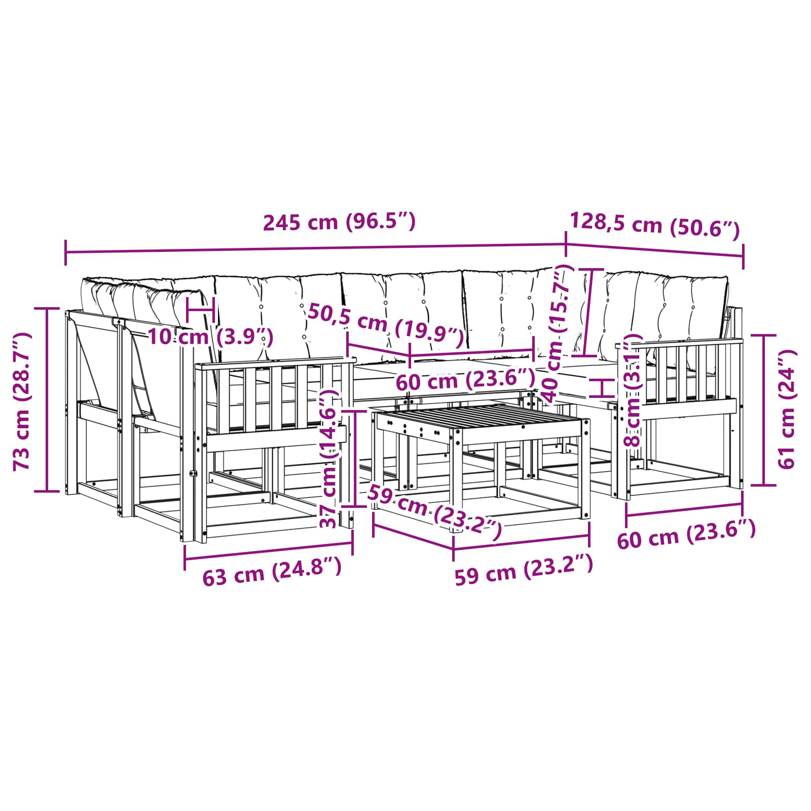 - 4 x Canapea mijloc: 59 x 63 x 73 cm (LxWxH)