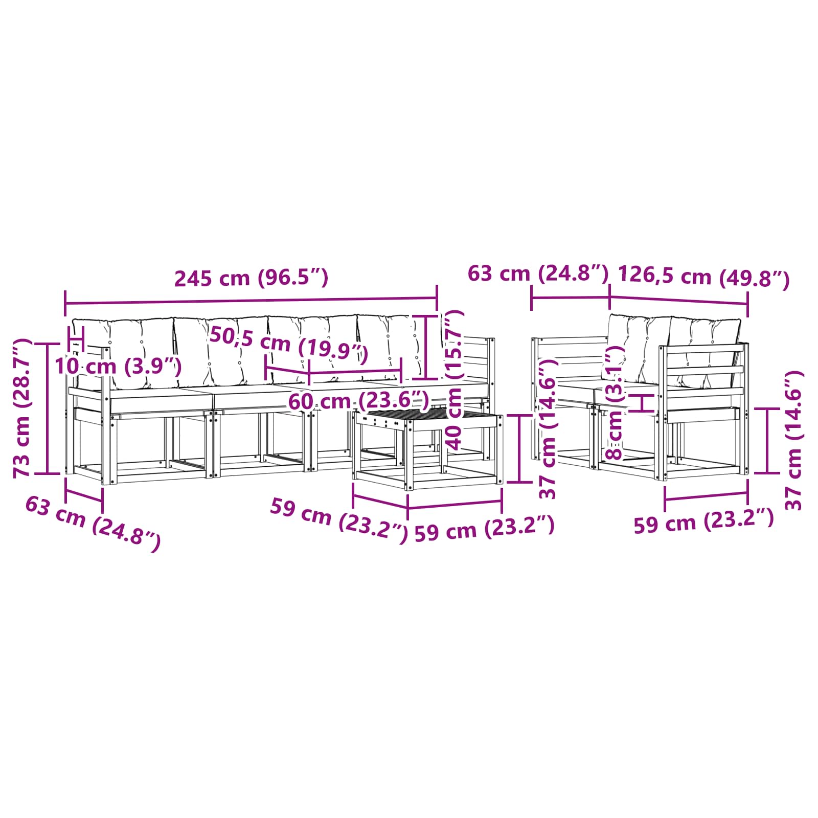 - 6 x Canapea intermediară: 59 x 63 x 73 cm (LxWxH)