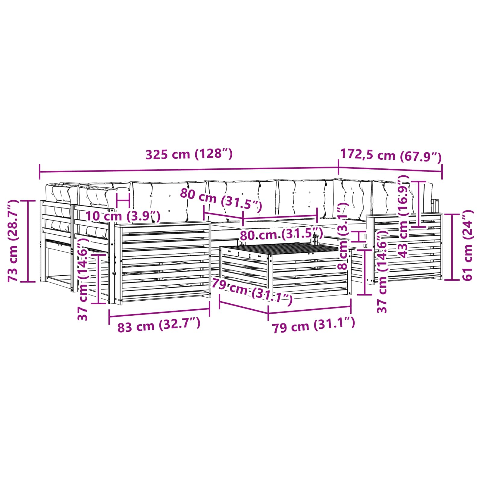 - 4 x Canapea din mijloc: 79 x 83 x 73 cm (LxWxH),2 x Canapea de colț: 83 x 83 x 73 cm (LxWxH)