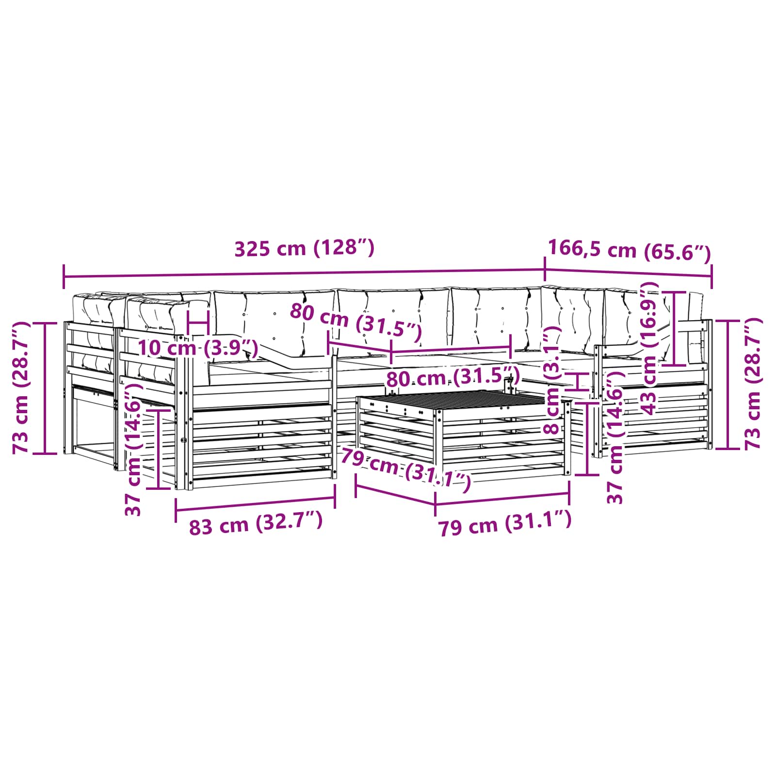 - 4 x Canapea din mijloc: 79 x 83 x 73 cm (LxWxH),2 x Canapea de colț: 83 x 83 x 73 cm (LxWxH)