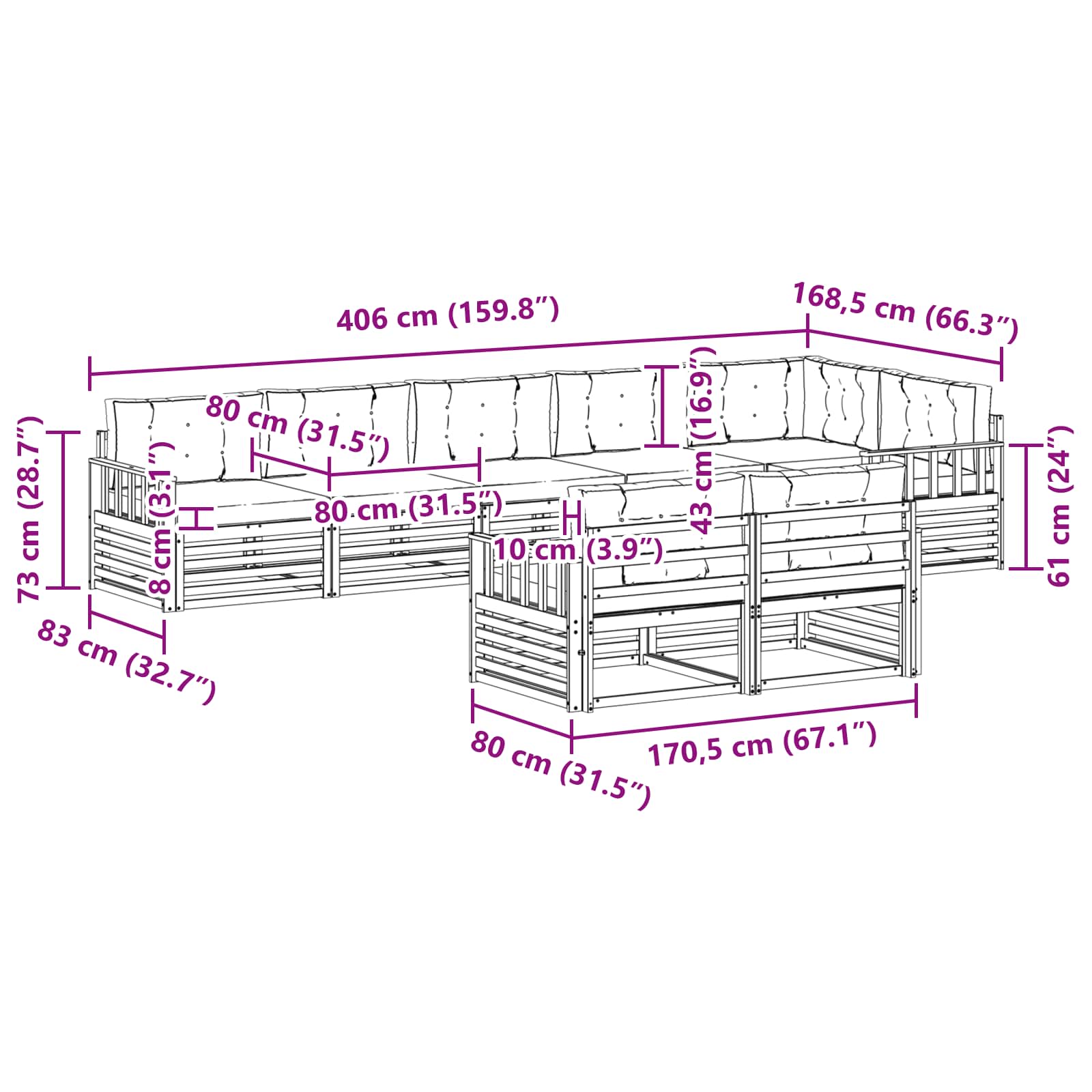- 8 x Perne de șezut: 80 x 80 x 8 cm (LxWxH)