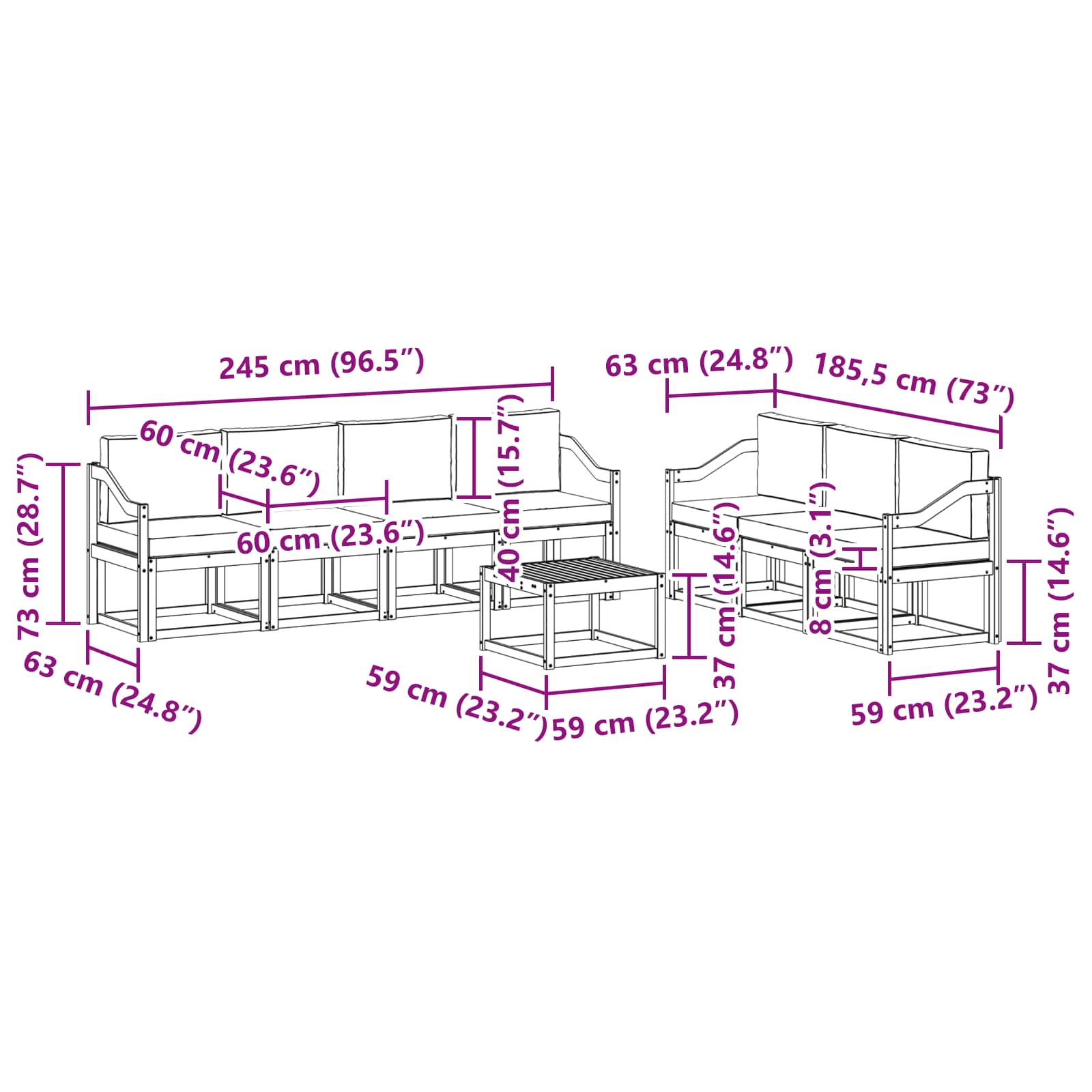 - 7 x Canapea Medie: 59 x 63 x 73 cm (L x l x H)