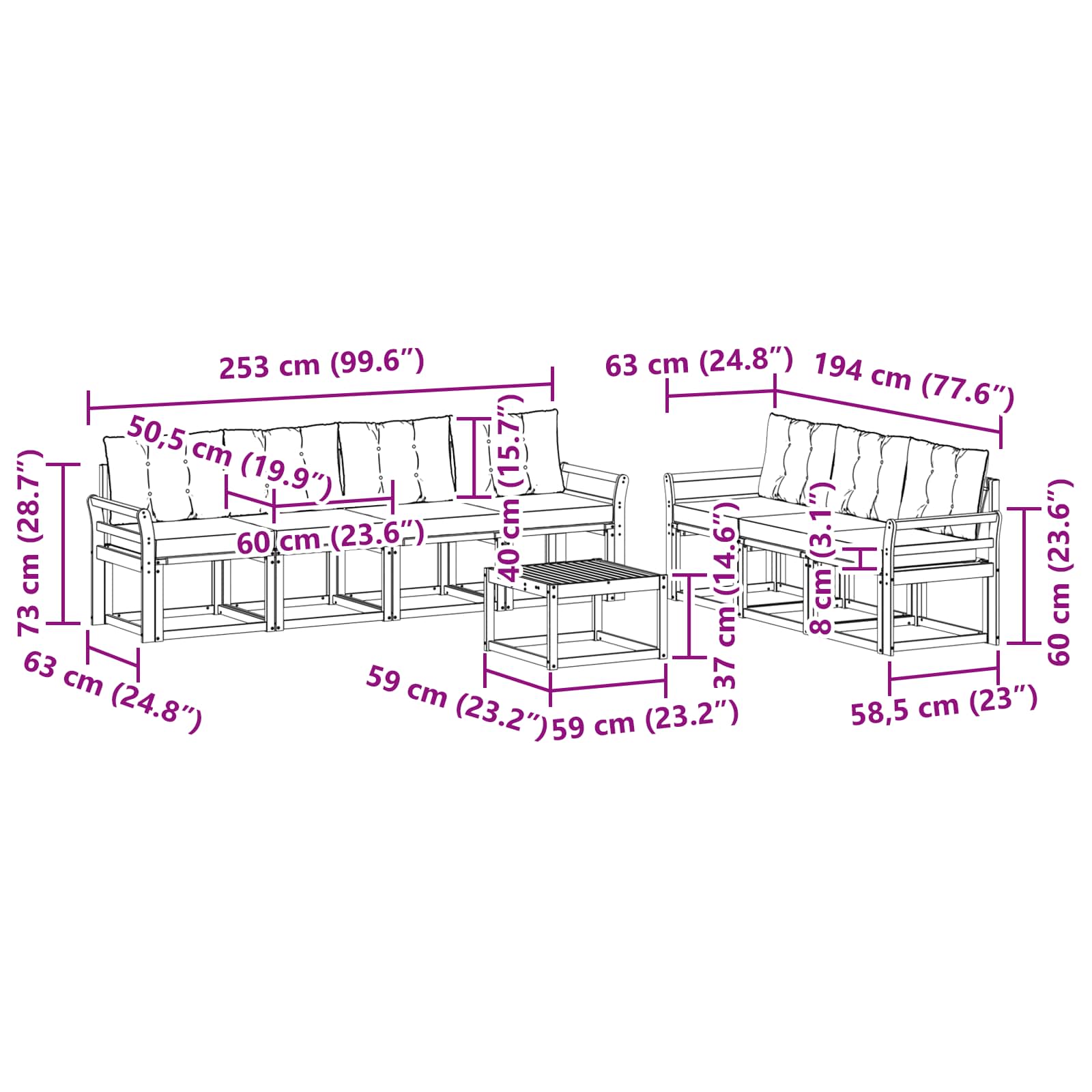 - 7 x Sohală de mijloc: 59 x 63 x 73 cm (LxWxH)