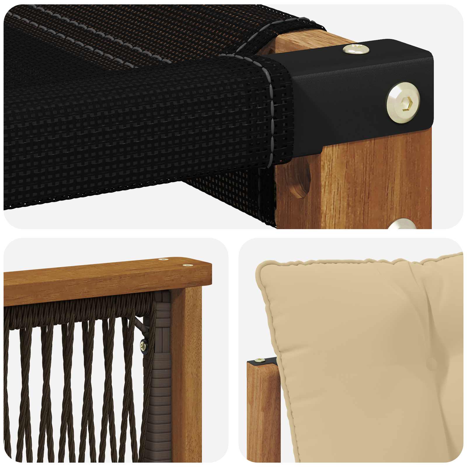 - Materiale: Cadru din lemn masiv de acacia, oferind nu doar frumusețe, ci și durabilitate. Are o textură naturală care adaugă la aspectul său și rezistă la vreme. Textilena din șezut și spate e confortabilă, nu se decolorează și e perfectă pentru soare și vreme variată.