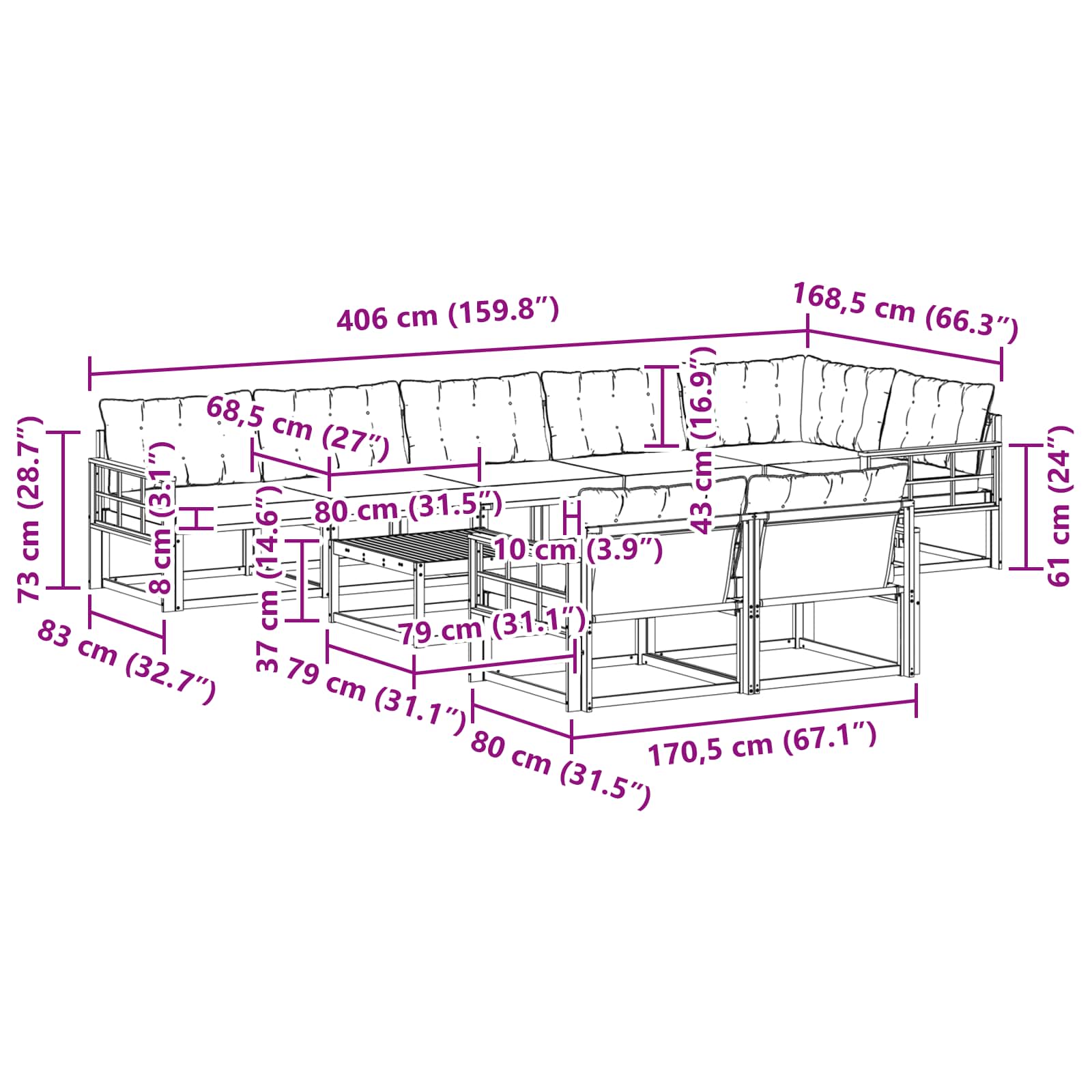 - 7 x Canapea mijlocie: 79 x 83 x 73 cm (LxWxH)