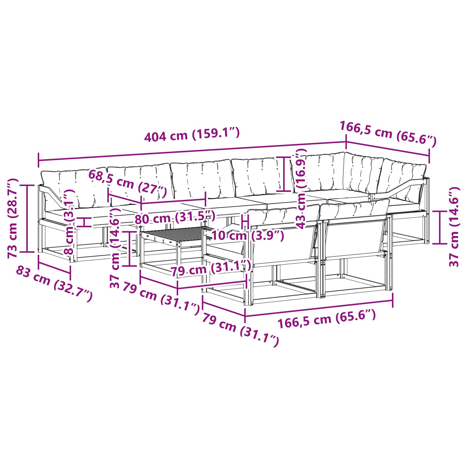 - 7 x Canapea de mijloc: 79 x 83 x 73 cm (LxWxH)
