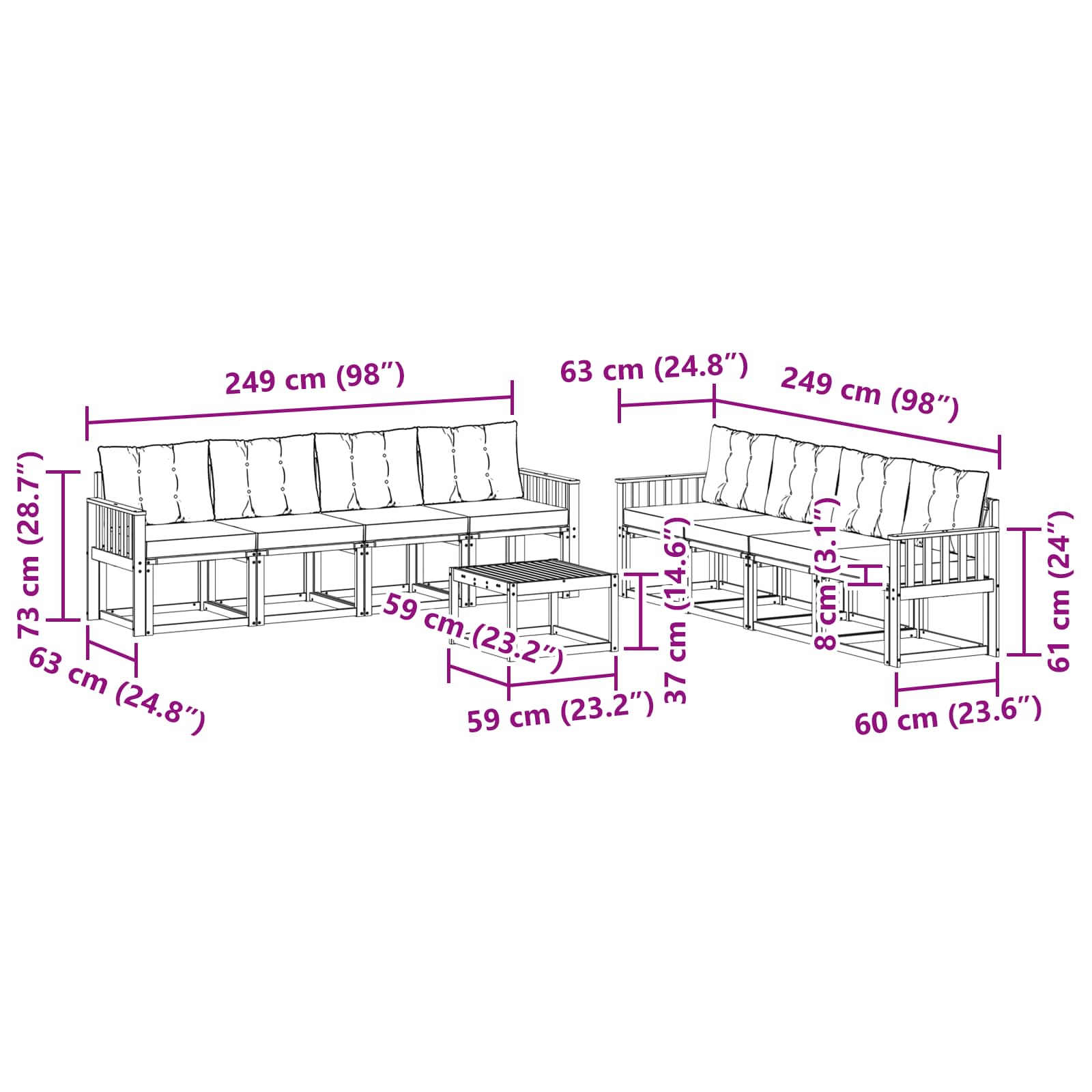 - 8 x Canapea Mijlocie: 59 x 63 x 73 cm (LxWxH)