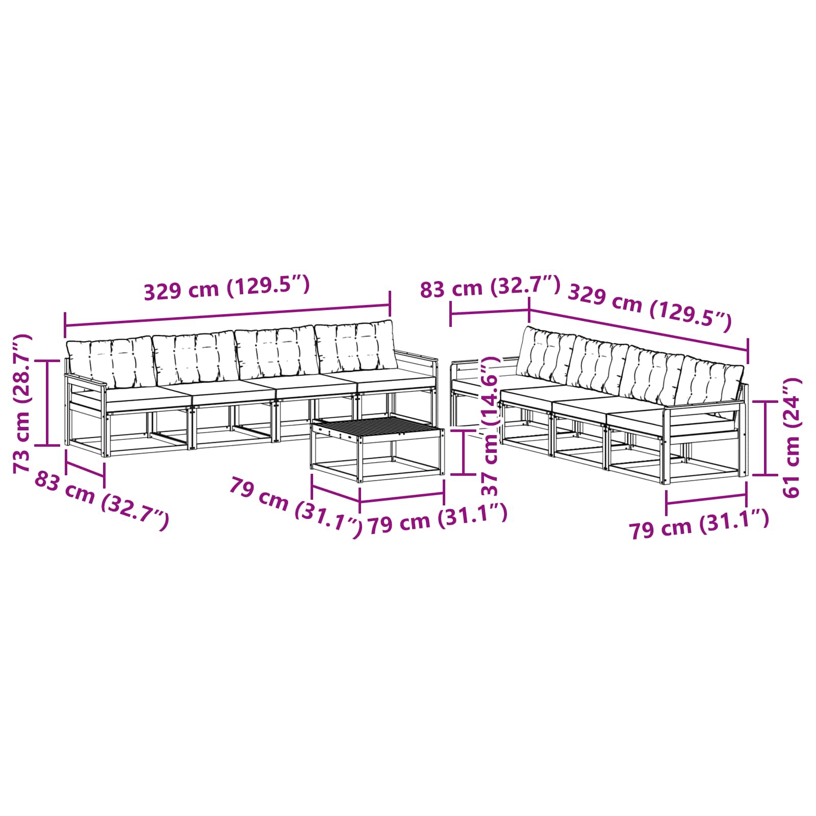 - 8 x Canapea din mijloc: 79 x 83 x 73 cm (LxWxH)