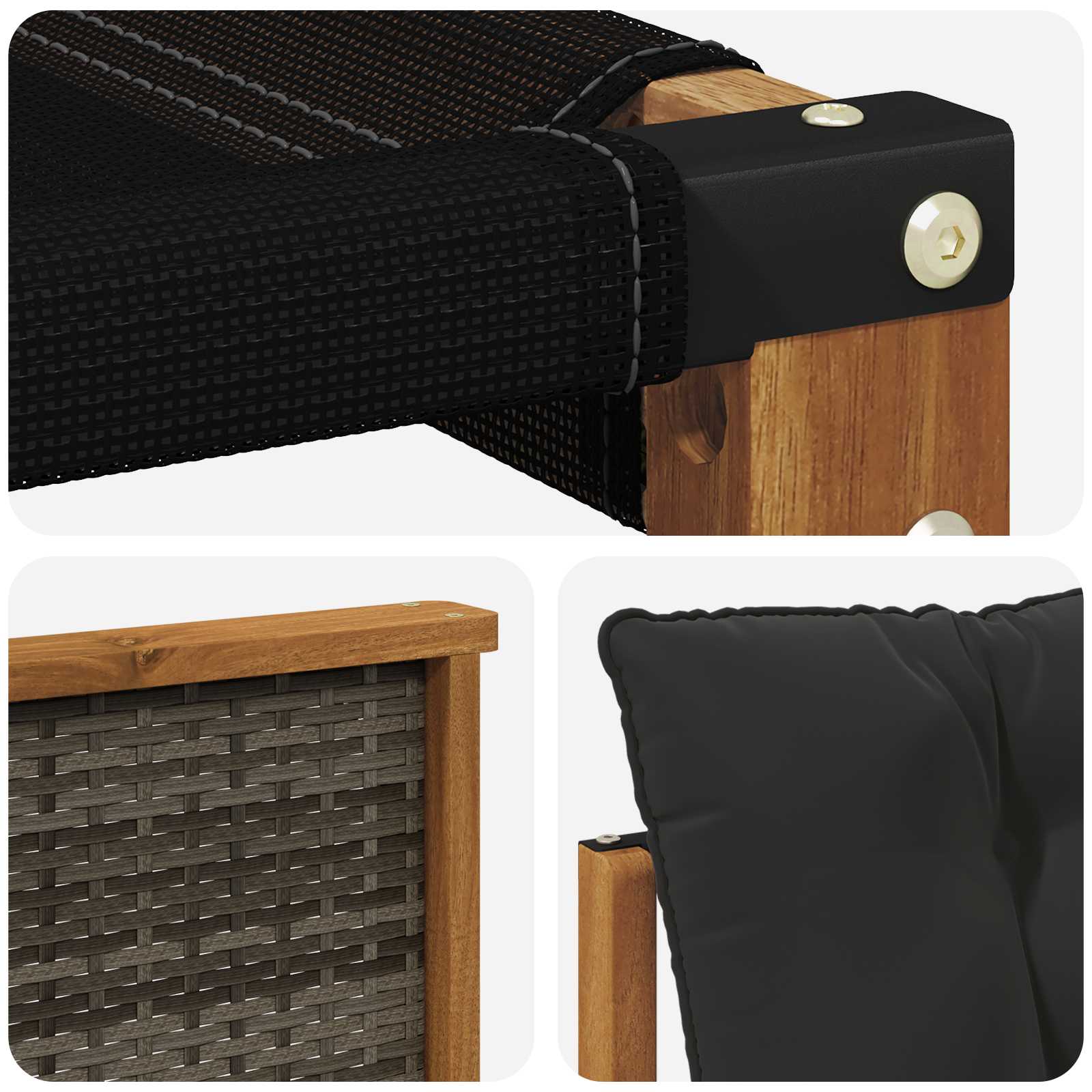 • Componente incluse: Setul vine cu perne pufoase, umplute cu spumă, menite să ofere confort pe termen lung. Husele pernelor se pot da jos pentru a fi curățate ușor cu un fermoar. Mânerele din lemn oferă suport și un loc plăcut pentru odihnă, crescând relaxarea.