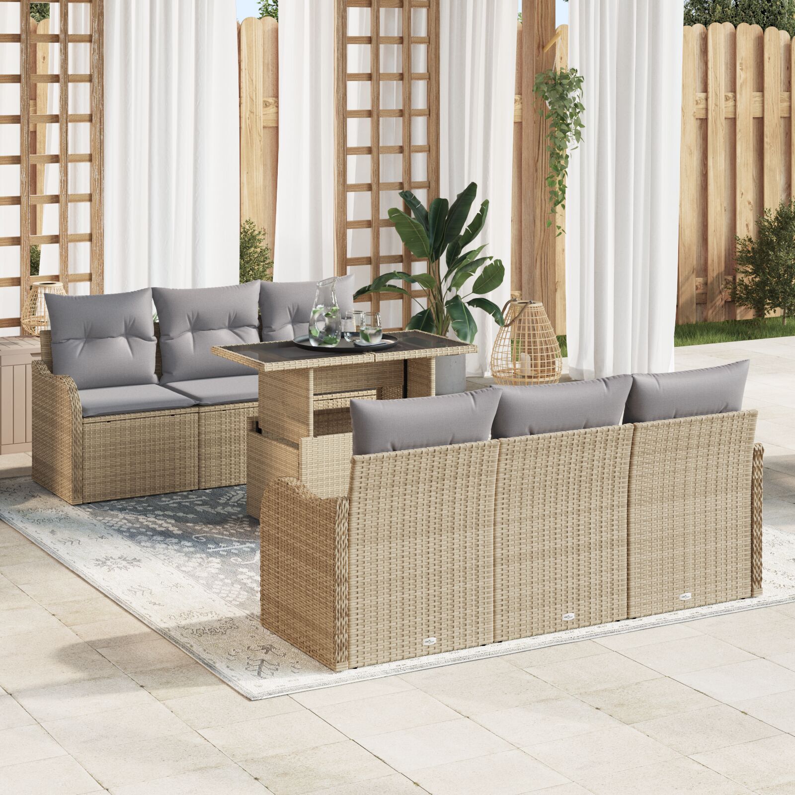 Set de canapele de grădină 7 piese cu perne bej din poli ratan, Canapea de grădină cu 2 locuri și depozitare & perne bej din poli ratan GartenMobel Dekor