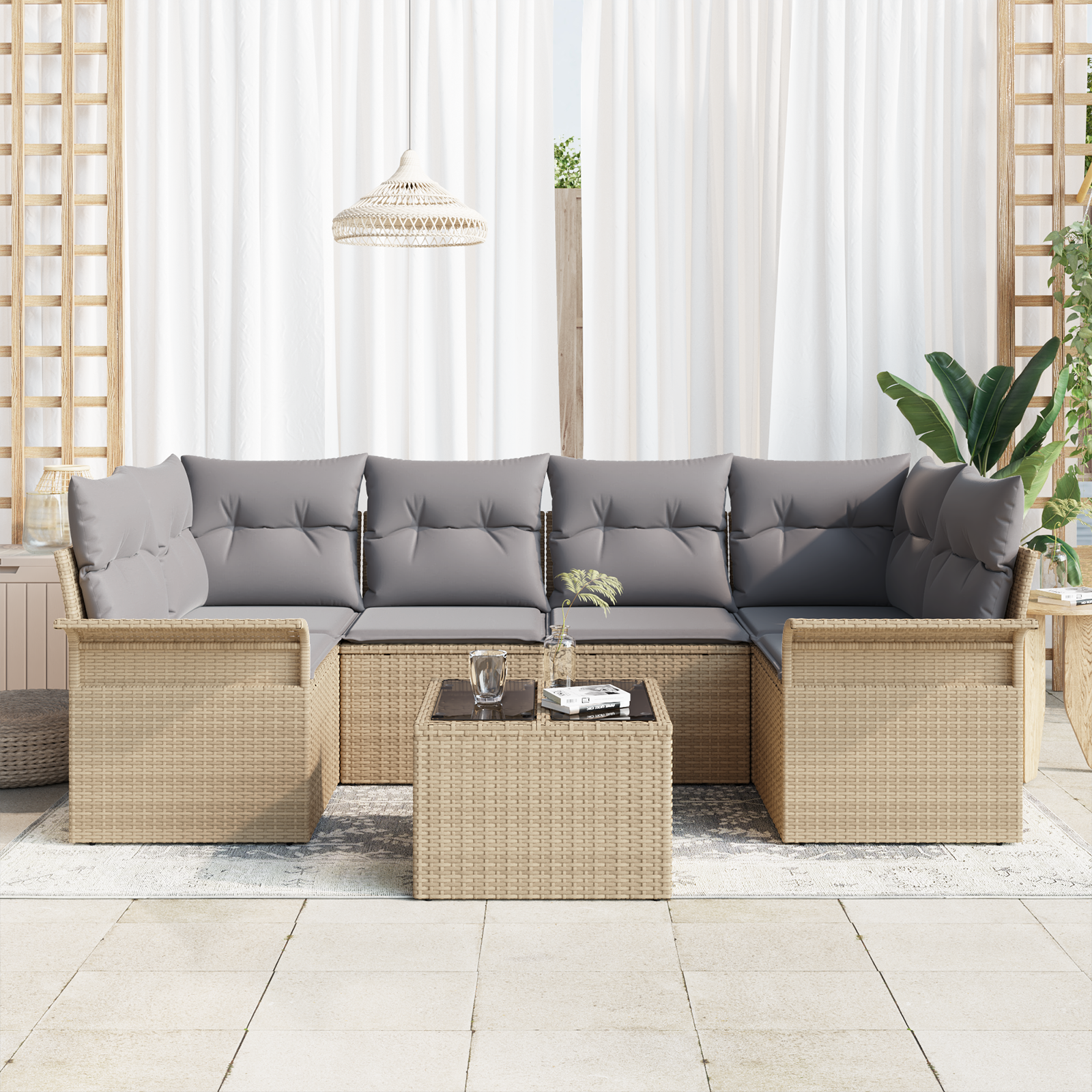 - Materiale Durabile: Fabricat din poliratan de înaltă calitate, acest set de canapele arată bine indiferent de vreme, asigurându-te că va dura mult timp. În plus, cu protecția UV, acest mobilier exterior rămâne luminos și rezistent la decolorare, fiind potrivit pe tot parcursul anului.