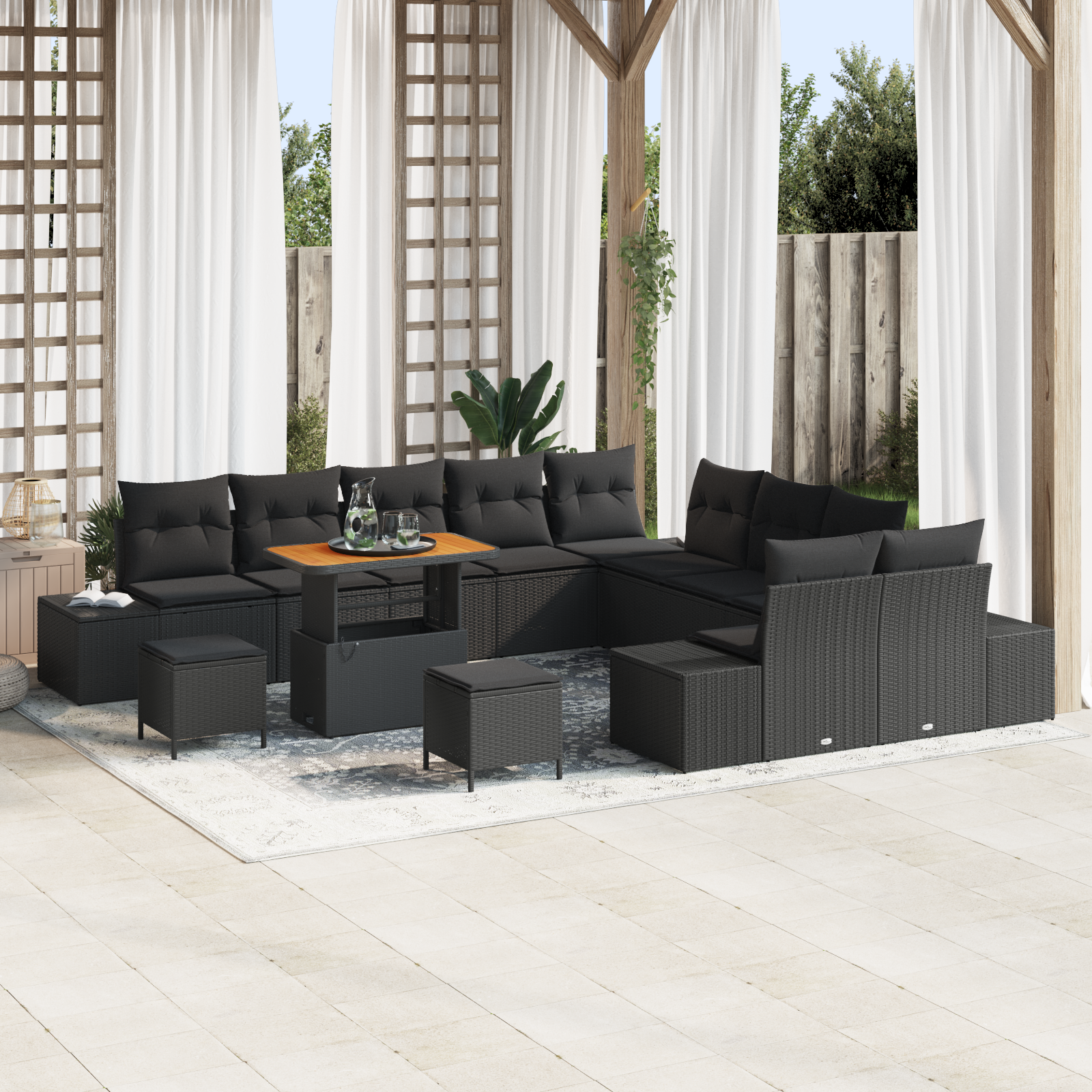 Set de canapele de grădină cu 13 piese cu perne Negru Poliratan Acacia, Canapea de grădină cu 2 locuri cu spațiu de depozitare și perne Negru Poliratan, Set de dining de grădină cu 3 piese cu perne Negru Poliratan Acacia GartenMobel Dekor