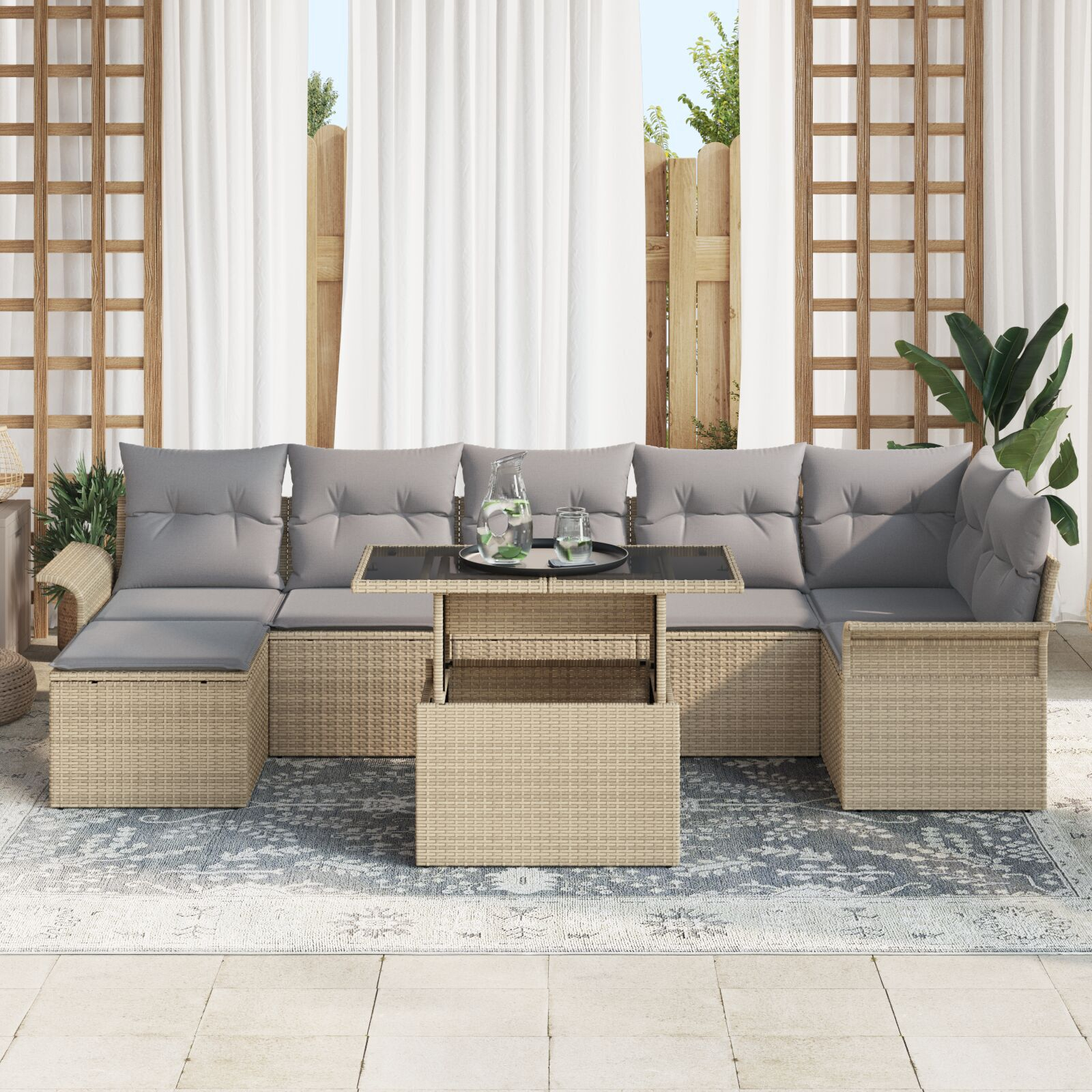 Setul de canapele de grădină cu 8 piese în Bej îmbină stilul cu funcționalitatea, fiind alegerea perfectă pentru orice spațiu exterior. Indiferent dacă stai la soare, organizezi un eveniment sau te bucuri de o masă afară, te ajută cu multe locuri confortabile și un vibe modern.