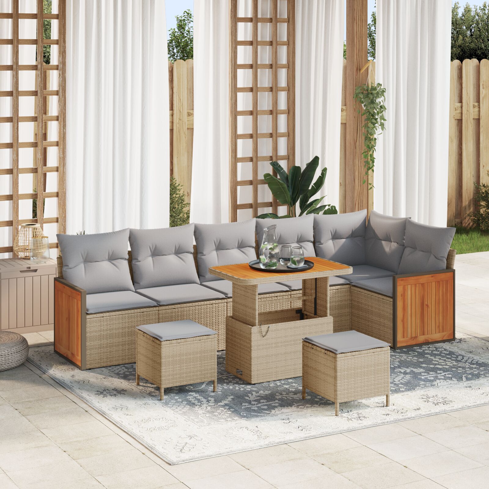 - Construcție robustă: Cu un cadru din ratan natural, setul e construit pentru a dura, făcându-l să facă față vremii, dar și să arate bine.