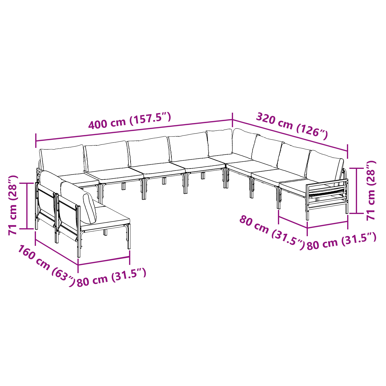 - Mărime: 400 x 320 x 71 cm (W x L x H)<\li>
