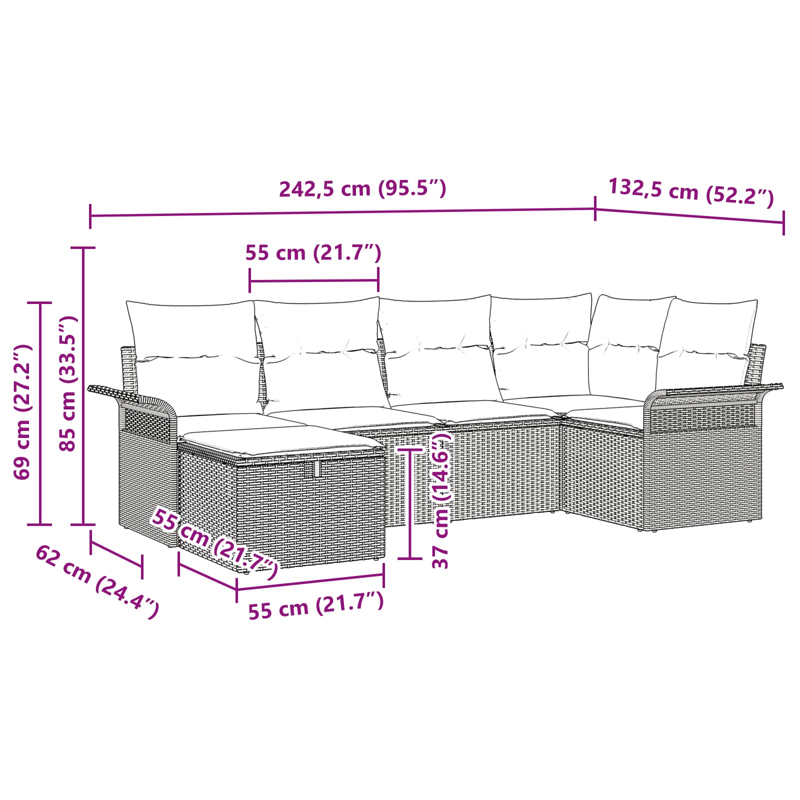 - 6 x perne de șezut: 55 x 55 cm (LxW)