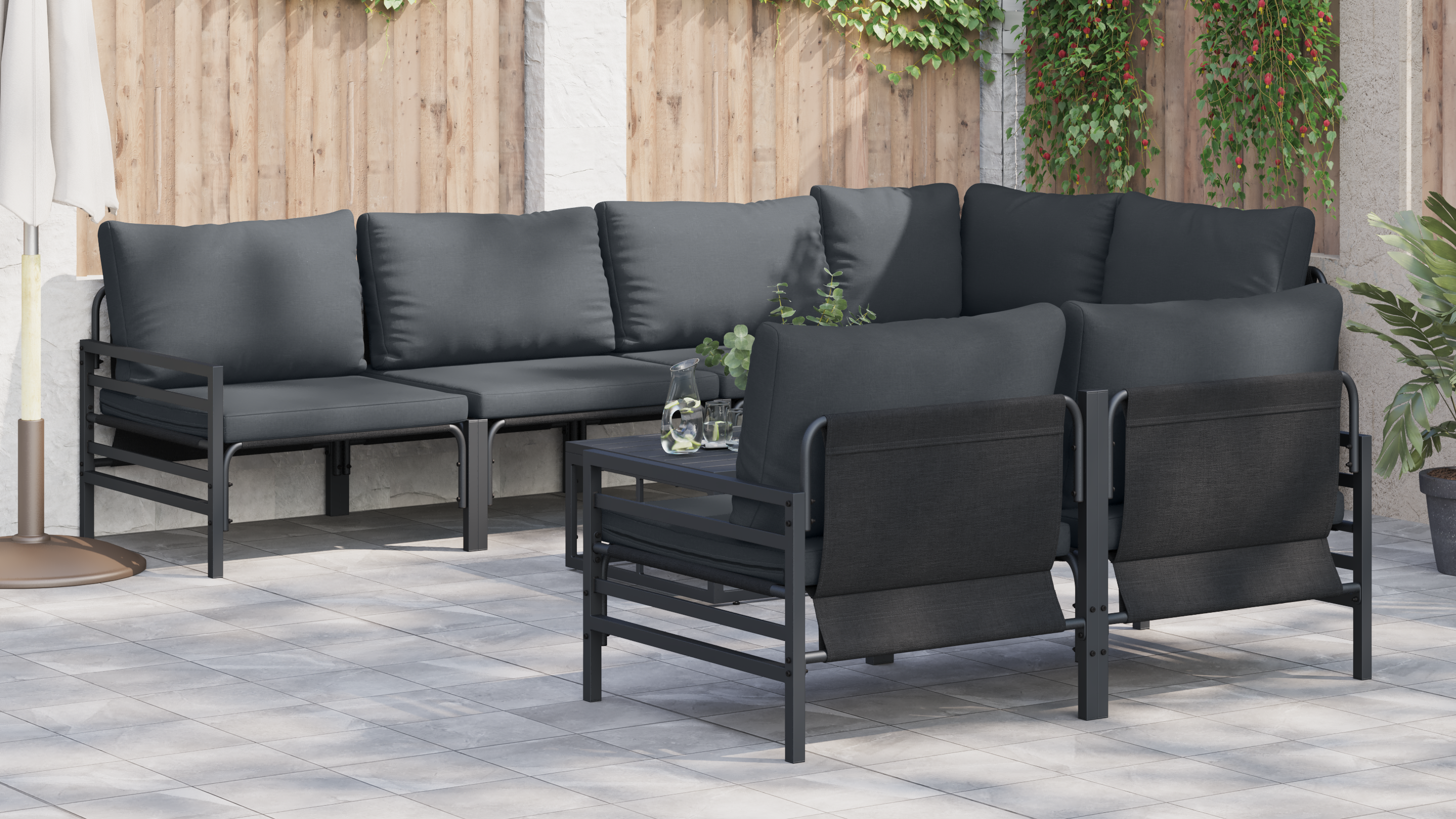 Acest set trendy de canapele pentru exterior e alegerea perfectă pentru grădini și terase, oferind un șezut elegant și flexibil. Cu un design simplu și linii curate, are un aspect modern care se potrivește cu orice stil. Terminat într-o nuanță chic antracit, creează un loc primitor unde să te relaxezi sau să te distrezi cu prietenii.