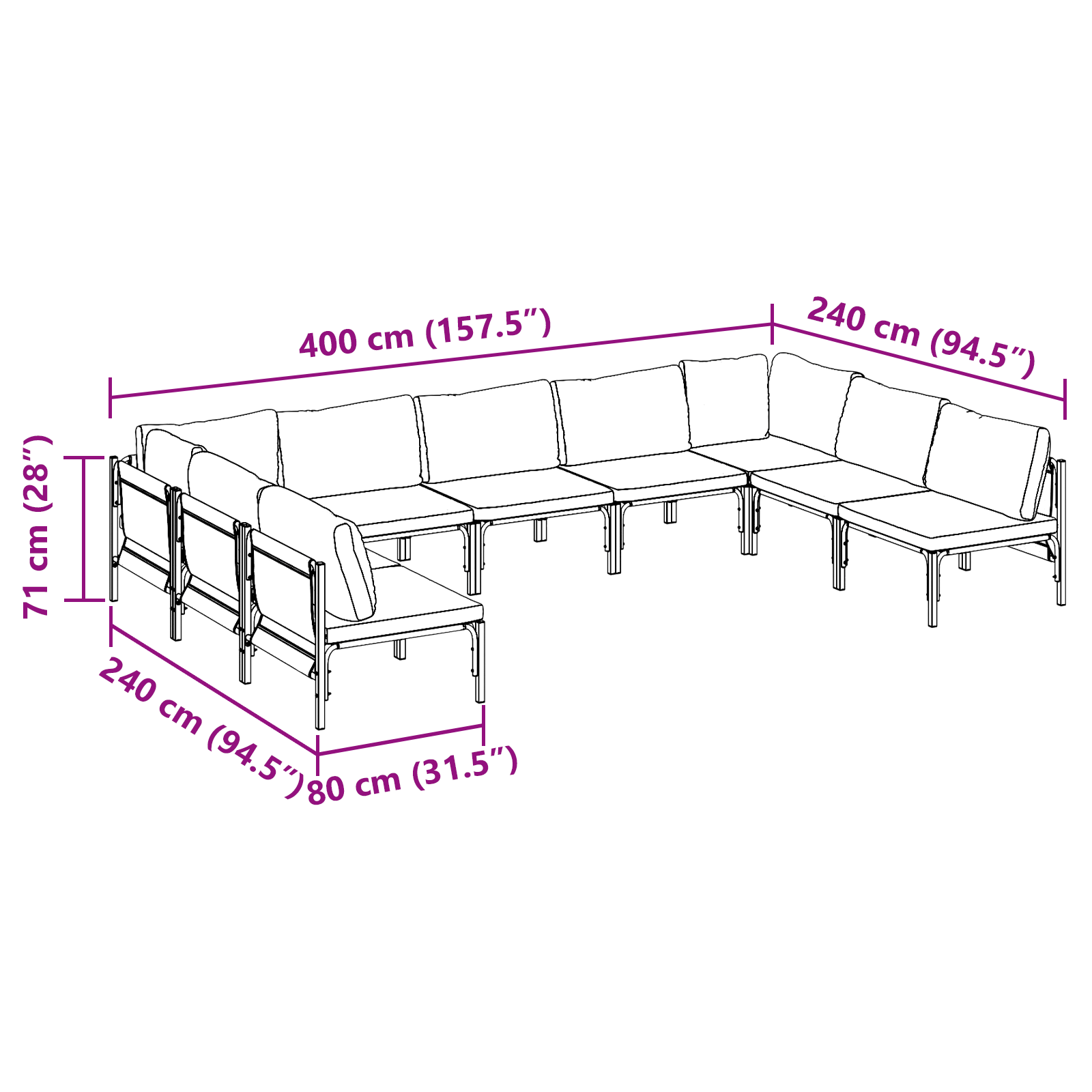 - Mărime: 400 x 240 x 71 cm (W x L x H)<\li>