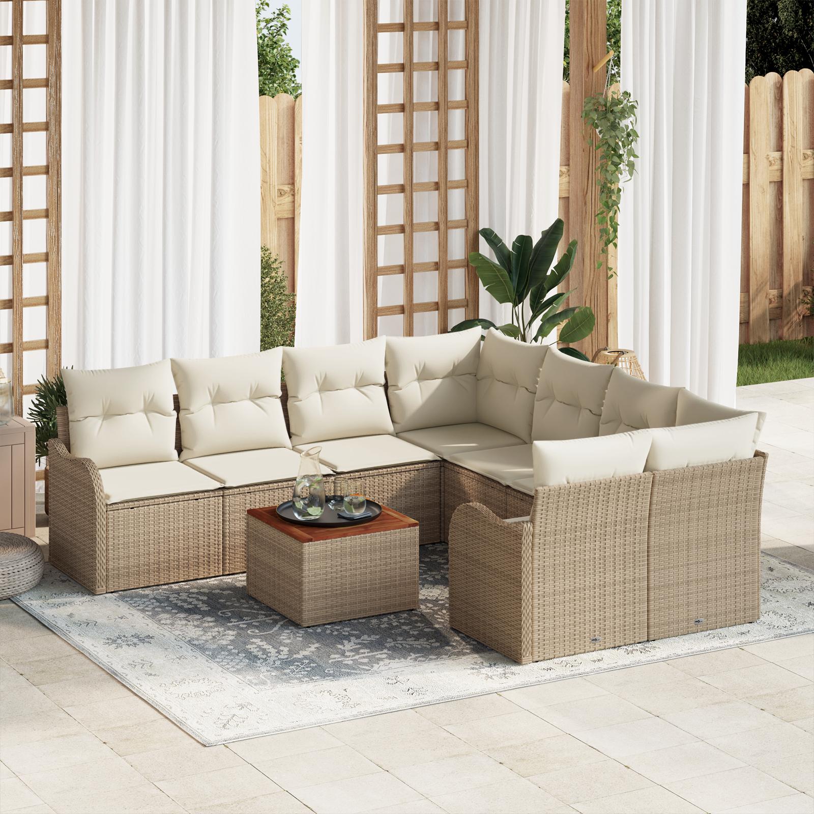 Set de Canapele pentru Grădină cu 9 Piese și Perne Bej din Ratan Poly Acacia, Sofă de Grădină cu 2 Locuri și Perne Bej din Ratan Poly GartenMobel Dekor